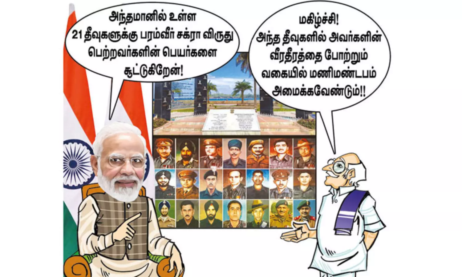 நேதாஜி வாழ்ந்த அந்தமான் தீவில் அவரது வாழ்க்கையை, அவரது பங்களிப்பை என்றென்றும் நாடு நினைவு கூரும் வகையில், ஒரு நினைவிடம் கட்ட மத்திய அரசாங்கம் முடிவு செய்துள்ளது. அந்த நினைவிடத்தின் மாதிரியை பிரதமர் நரேந்திரமோடி காணொலி காட்சி மூலம் வெளியிட்டார். அந்த நினைவிடத்துக்கு அடிக்கல்லும் நாட்டினார். இந்த விழாவில்தான், இதுவரை பெயரிடப்படாத 21 தீவுகளுக்கு நாட்டின் பாதுகாப்புக்காக வீர தீர செயல்களில் ஈடுபட்டு பரம்வீர் சக்ரா விருது பெற்ற 21 வீரர்களின் பெயர்களை பிரதமர் சூட்டினார். இதிலொருவர் தமிழர். அவர் பெயர் மேஜர் ராமசாமி பரமேஸ்வரன். இவரது பெயர் ஏற்கனவே சென்னை பரங்கிமலை ராணுவ அதிகாரிகள் பயிற்சிக் கல்லூரியிலுள்ள அணிவகுப்பு பயிற்சி சதுக்கத்துக்கும், கோடம்பாக்கத்திலுள்ள ராணுவ வீட்டு வசதிவாரியத்துக்கும் வைக்கப்பட்டுள்ளது. 21 வீரர்களின் பெயர்கள் சூட்டப்பட்டது மகிழ்ச்சி அளிக்கிறது. பாராட்டுக்குரியது. ஆனால், வெறுமனே தீவுகளுக்கு பெயர் வைத்துவிடுவதோடு நின்றுவிடாமல், அவர்களின் சிலைகளைக் கொண்ட மணிமண்டபங்களை அந்தந்த தீவுகளில் அமைத்து, அவர்களின் வீர தீர செயல்களை பொறித்துவைக்க வேண்டும். அந்த தீவுகளை சுற்றுலா தலங்களாக மேம்படுத்தி, அந்தமானுக்கு வரும் சுற்றுலா பயணிகள் இந்த தீவுகளுக்கும் சென்றுவர ஏற்பாடு செய்யவேண்டும் என்பதே அவர்களுக்கு வீர வணக்கம் செலுத்துபவர்களின் கோரிக்கையாக இருக்கிறது.