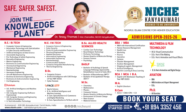 கன்னியாகுமரி நூருல் இஸ்லாம் உயர் கல்வி மையத்தில் படித்து முடித்ததும் 80 சதவீதம் பேருக்கு உடனடி வேலைவாய்ப்பு துணை வேந்தர் டெஸ்ஸி தாமஸ் பெருமிதம்!