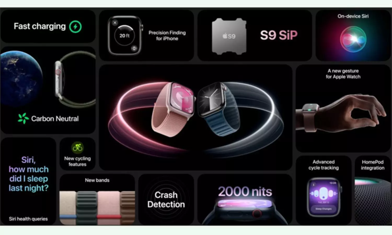 இதுதொடர்பாக வெளியிடப்பட்டுள்ள படம் ஆப்பிள் வாட்ச் சீரிஸ் 9 விவரக்குறிப்புகளைச் சுருக்கமாகக் கூறுகிறது. .