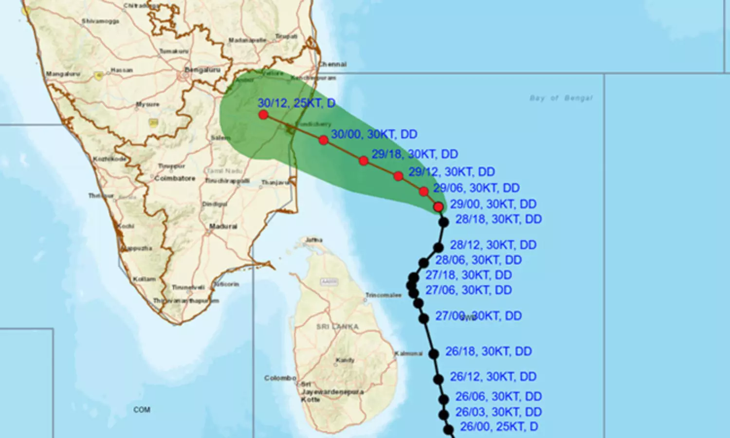 வங்கக்கடலில் நிலை கொண்டுள்ள ஆழ்ந்த காற்றழுத்த தாழ்வு மண்டலம் மணிக்கு 7 கி.மீ. வேகத்தில் நகர்கிறது. நாகையில் இருந்து 310 கி.மீ. தொலைவிலும் புதுச்சேரியில் இருந்து 360 கி.மீ. தொலைவிலும் சென்னைக்கு தென்கிழக்கே சுமார் 400 கி.மீ. தொலைவிலும் காற்றழுத்த தாழ்வு மண்டலம் நிலை கொண்டுள்ளது.