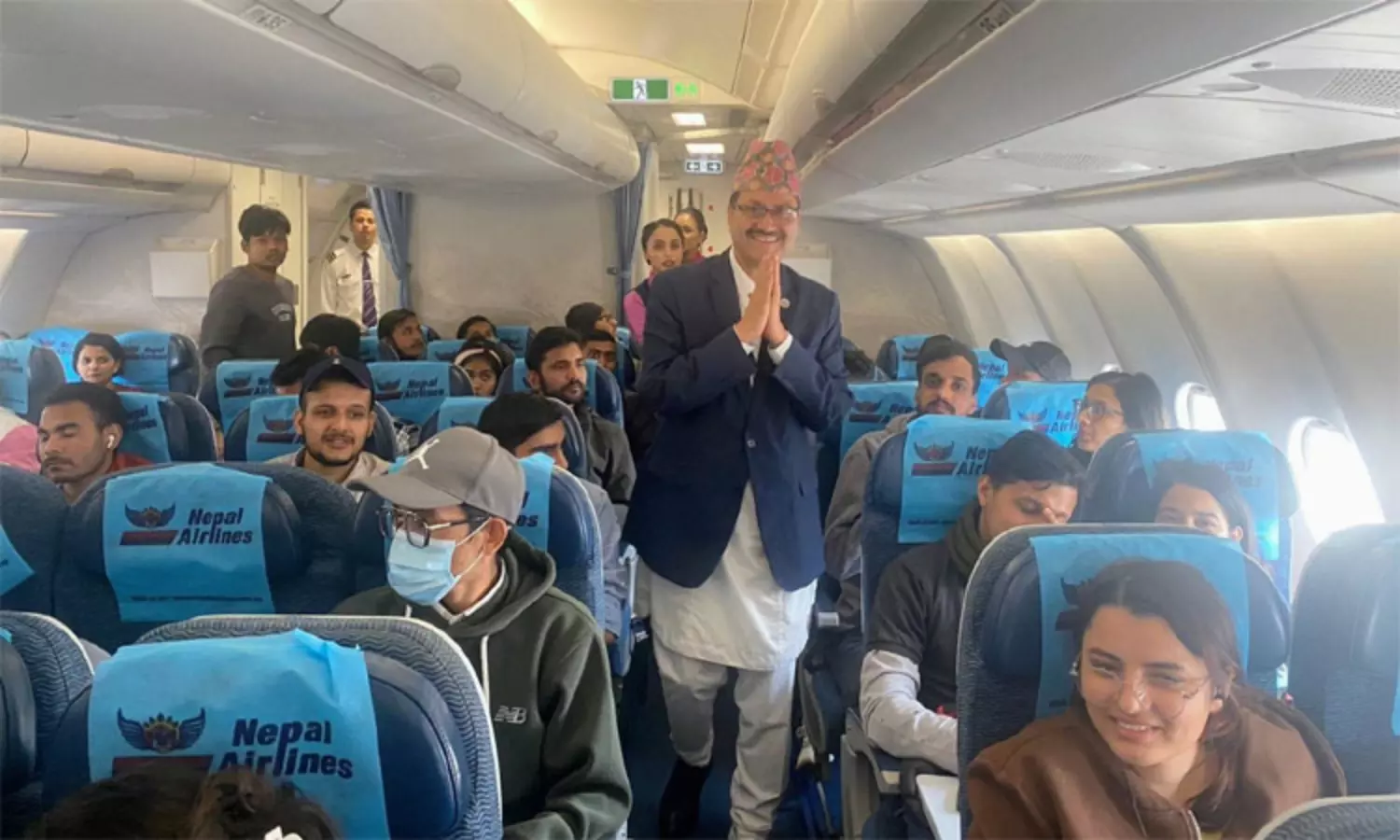 இஸ்ரேலின் டெல் அவிவ் நகரில் இருந்து நேபாளம் தனது 253 மாணவர்களை விமானம் மூலம் அழைத்து வந்தது. விமானத்தில் பயணித்த மாணவர்களை வெளியுறவு அமைச்சர் என்பி சவுத் வரவேற்றார்.