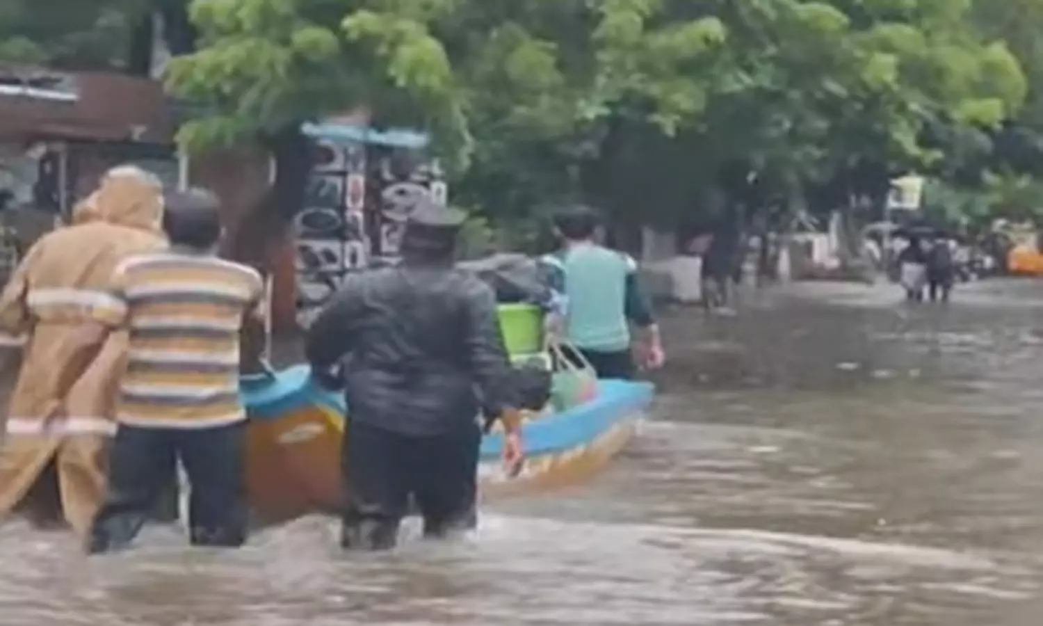 வங்கக் கடலில் உருவான ஆழ்ந்த காற்றழுத்த தாழ்வு பகுதி இன்று வலுவடைய இருக்கிறது. இதன் எதிரொலியாக பல்வேறு இடங்களில் கனமழை கொட்டி தீர்த்து வருகிறது. இந்தநிலையில், சென்னை மற்றும் புறநகர் பகுதிகளில் கனமழை பெய்து வருகிறது. இந்தநிலையில், வேளச்சேரி ஏஜிஎஸ் காலனியில் 10க்கும் மேற்பட்ட தெருக்களில் வெள்ளநீர் சூழ்ந்தது. முழங்கால் வரை வெள்ளநீர் சூழ்ந்ததால் வெள்ளநீர் குடியிருப்புகளுக்குள் புகுந்தது. வீடுகளில் சிக்கிய முதியவர்கள், பெரியவர்கள் குழந்தைகளை தீயணைப்பு துறையினர் படகுகள் மூலம் மீட்டனர். மழைநீரை அகற்றும் பணியில் மாநகராட்சி ஊழியர்கள் மும்முரமாக ஈடுபட்டுள்ளனர்.