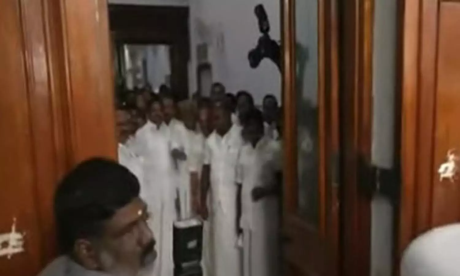 இதனைத்தொடர்ந்து சட்டப்பேரவையில் அமளியில் ஈடுபட்ட அதிமுக எம்.எல்.ஏ.க்களை வெளியேற்ற அவைக் காவலர்களை சபாநாயகர் அழைத்த நிலையில், சபாநாயகரை கண்டித்து முழக்கமிட்டபடியே அதிமுகவினர் வெளிநடப்பு செய்தனர்.