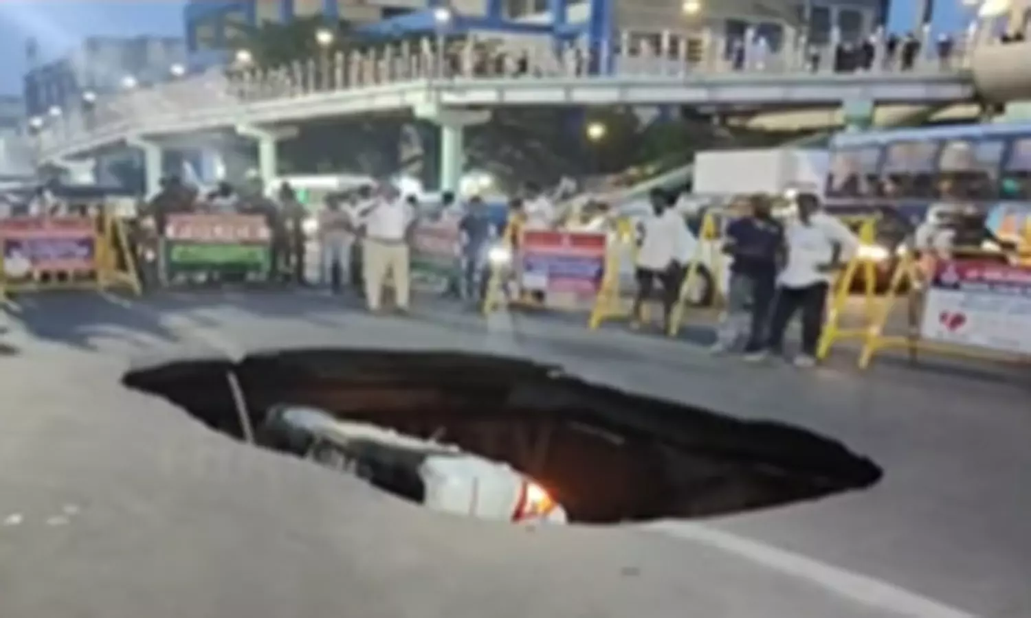 சென்னை தரமணியில் இருந்து திருவான்மியூர் சாலையில் திடீரென பள்ளம் ஏற்பட்டது. இதில், கார் ஒன்று கவிழ்ந்தது. விபத்து நடந்த இடத்தில் இருந்து 300 மீட்டர் தொலைவில்தான் மெட்ரோ ரெயில் பணிகள் நடந்து வருகின்றன. அதனால், இந்த விபத்திற்கும், மெட்ரோ ரெயில் பணிக்கும் எந்தவித தொடர்பும் இல்லை என மெட்ரோ ரெயில் நிர்வாகம் தெரிவித்து உள்ளது.