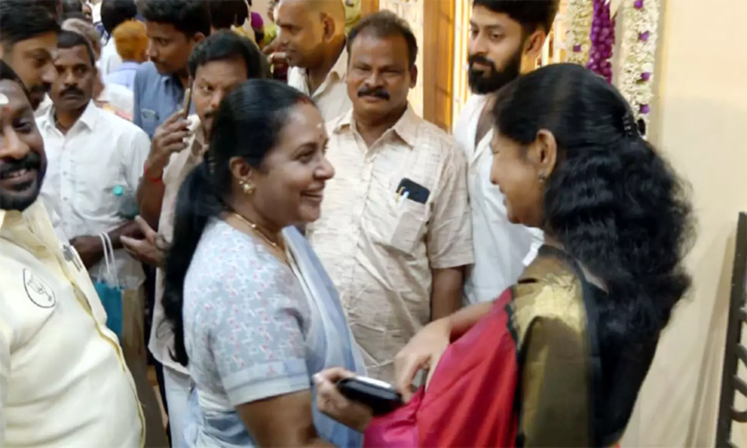 சென்னை அண்ணா அறிவாலயத்தில் பாஜக எம்.எல்.ஏ. வானதி சீனிவாசன் மற்றும் திமுக எம்.பி. கனிமொழி ஆகியோர் சந்தித்து பேசினர். மையிலாபூர் எம்.எல்.ஏ த.வேலு இல்லத் திருமண விழாவில் கலந்து கொள்ள அண்ணா அறிவாலயம் வந்த பாஜக எம்.எல்.ஏ. வானதி சீனிவாசன். திமுக துணை பொதுச்செயலாளர் கனிமொழியிடம் புன்னகையுடன் நலம் விசாரித்தார்.