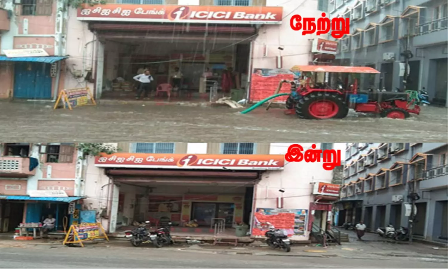 கனமழை காரணமாக ராயபுரம் மண்டலம் வார்டு 56 பிரகாசம் சாலை பகுதியில் நேற்று மழை நீர் தேங்கி இருந்த நிலையில் மாநகராட்சி ஊழியர்கள் டிராக்டரில் பொருத்தப்பட்ட மோட்டார் மூலம் நீரை அகற்றினர். தற்போது அந்த பகுதியில் முழுமையாக மழை நீர் வடிந்துள்ளது.