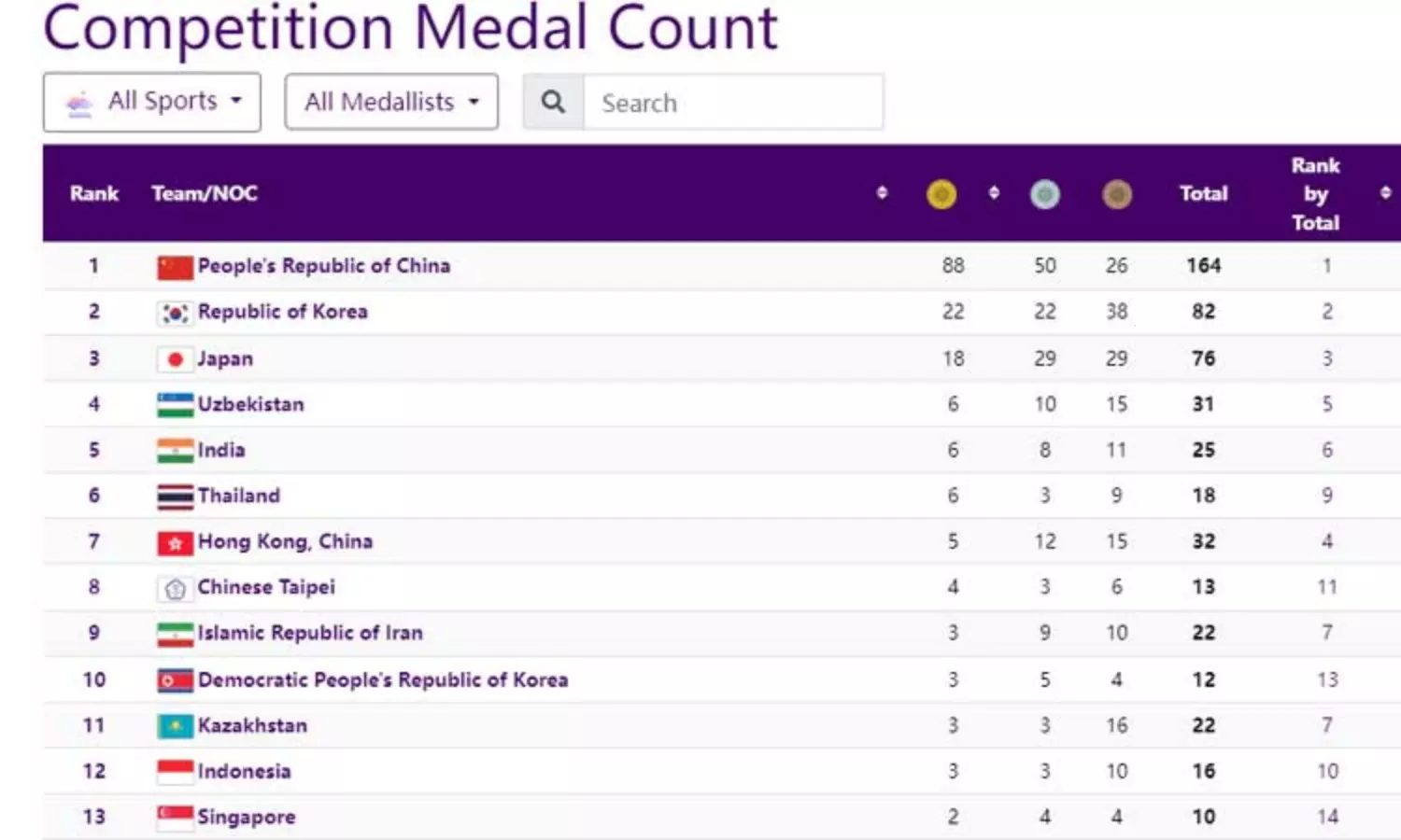 - சீனா : 85 தங்கம், 49 வெள்ளி பதக்கம், 26 வெண்கலம்- மொத்த பதக்கங்கள்; 160