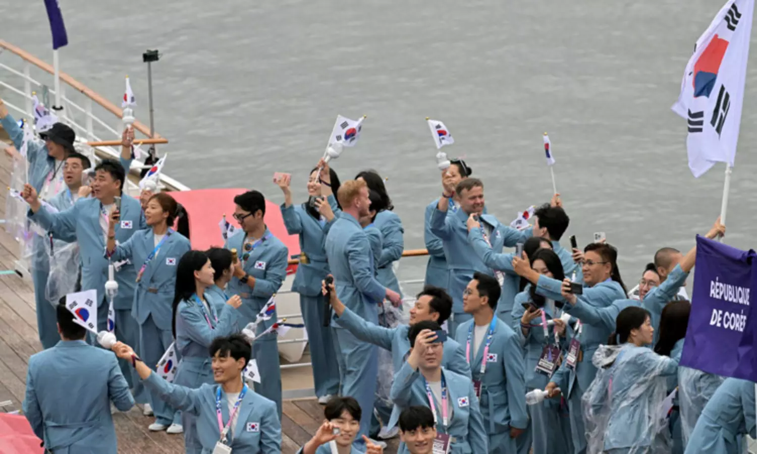 படகு அணிவகுப்பில் தென் கொரியா அணியினர். ... பாரீஸ் ஒலிம்பிக் கோலாகல தொடக்கம் - இந்திய தேசியக் கொடியை ஏந்திச்சென்ற சரத்கமல், பி.வி.சிந்து