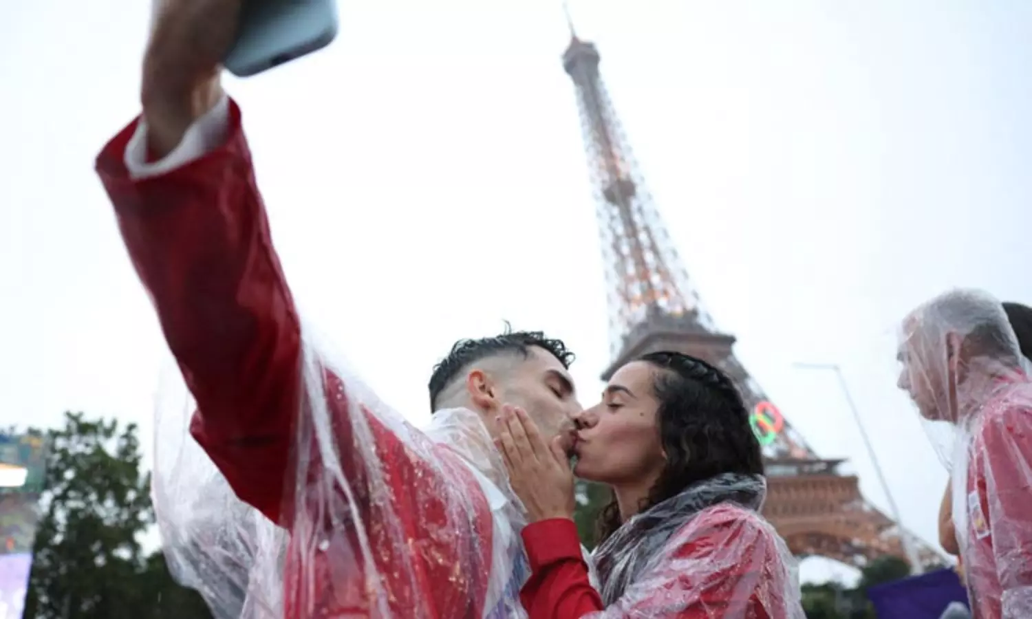 ஒலிம்பிக் தொடக்க விழாவின் போது ஈபிள் கோபுரத்தின் கீழ் முத்தமிட்டு கொண்ட ஸ்பெயின் விளையாட்டு வீரர்கள்.