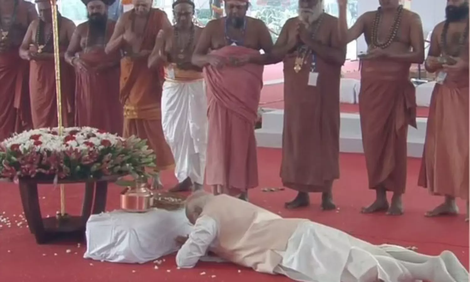புதிய நாடாளுமன்ற கட்டட திறப்பு விழாவில், தமிழ்நாட்டைச் சேர்ந்த ஆதீனங்கள் முன்னிலையில் செங்கோல் முன் பிரதமர் மோடி தரையில் விழுந்து வணங்கினார்.
