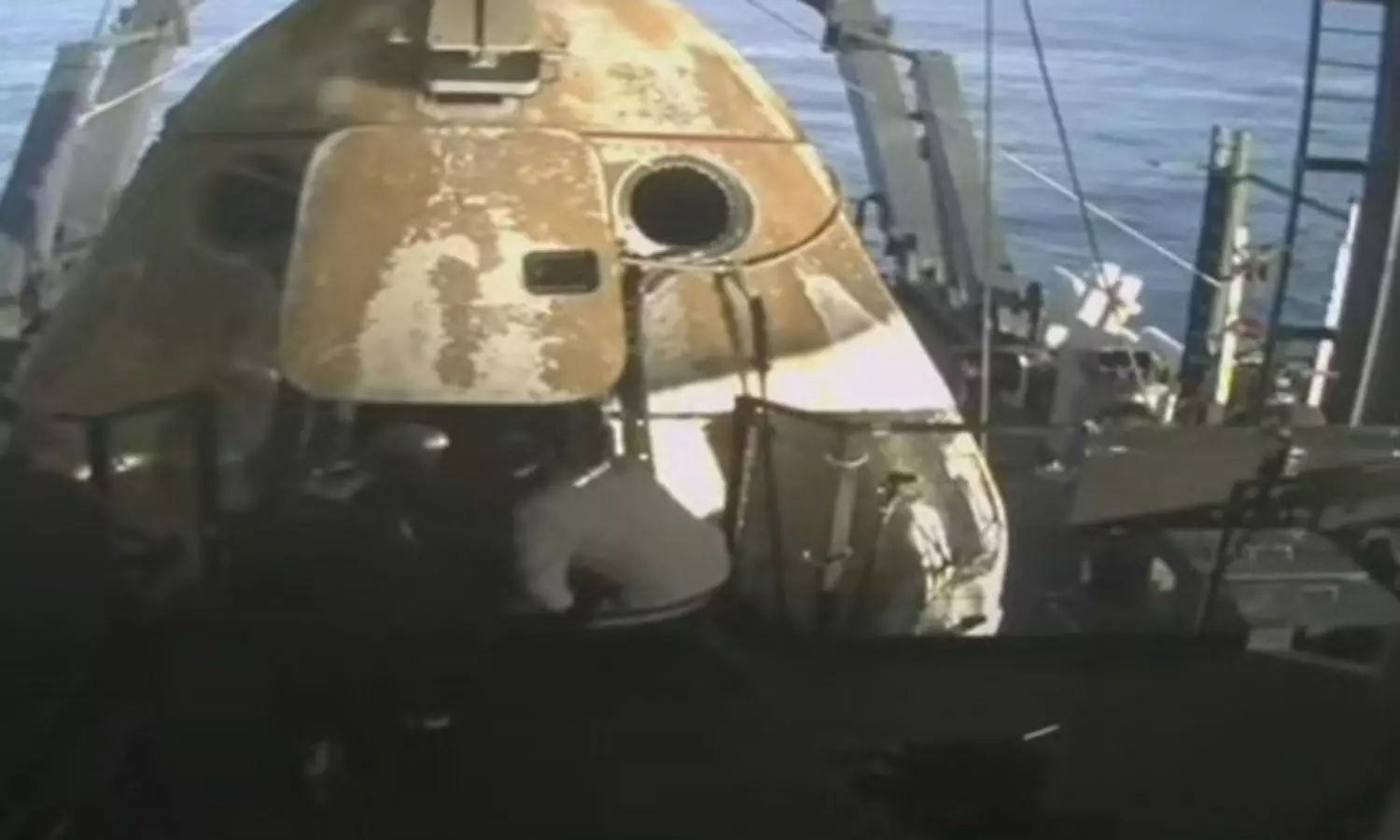 தரையிறங்கிய டிராகன் விண்கலனில் இருந்து வீரர்கள் அமரவைத்தப்படியே வெளியே வருகின்றனர். அமர வைத்தப்படி வீரர்கள் ஒவ்வொருவராக கப்பலுக்குள் அழைத்து செல்லப்படுகின்றனர்.