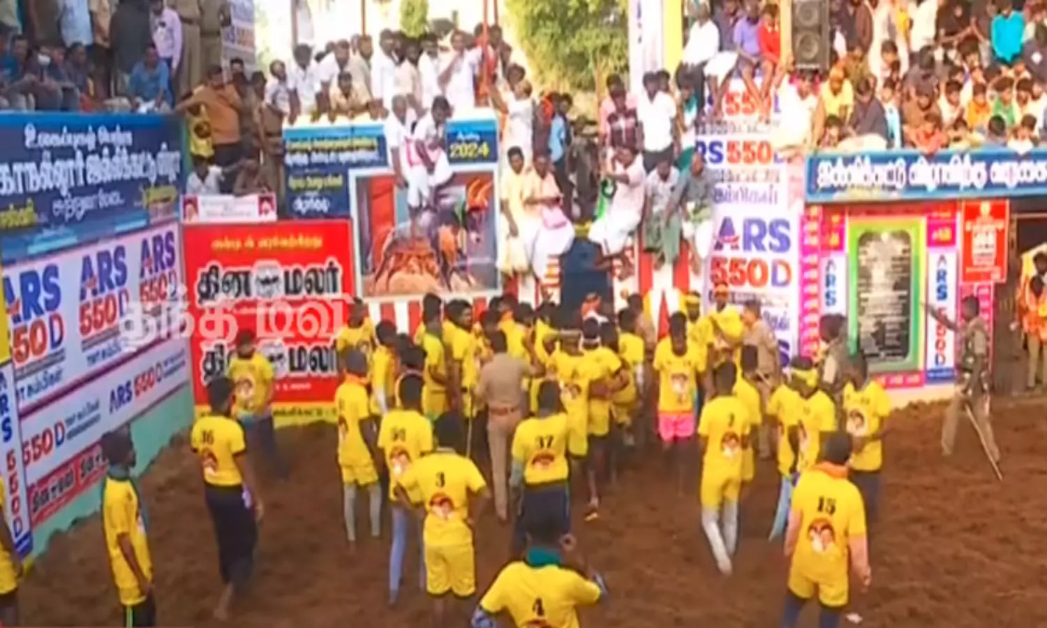ஜல்லிக்கட்டு போட்டியின் முதல் சுற்று விறுவிறுப்பாக நடைபெற்று வருகிறது. முதல் சுற்றில் மஞ்சள் நிற உடையில் மாடுபிடி வீரர்கள் பங்கேற்று வருகின்றனர்.