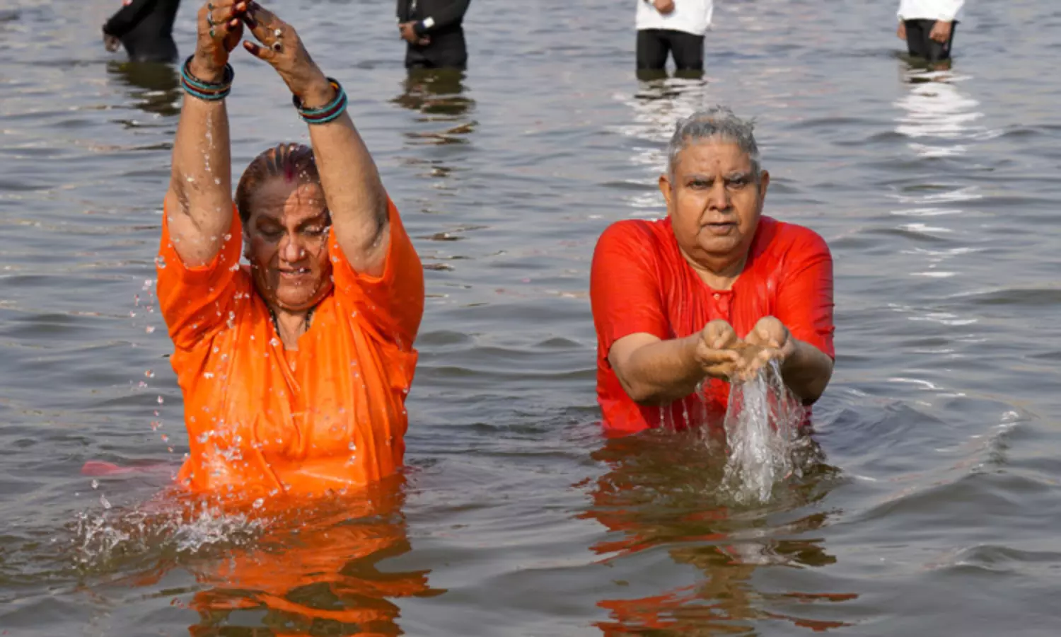 மகா கும்பமேளாவில் பங்கேற்ற துணை ஜனாதிபதி ஜெகதீப் தன்கர் மற்றும் அவரது மனைவி, திரிவேணி சங்கமத்தில் புனித நீராடினர்.