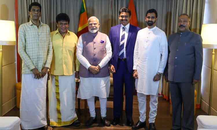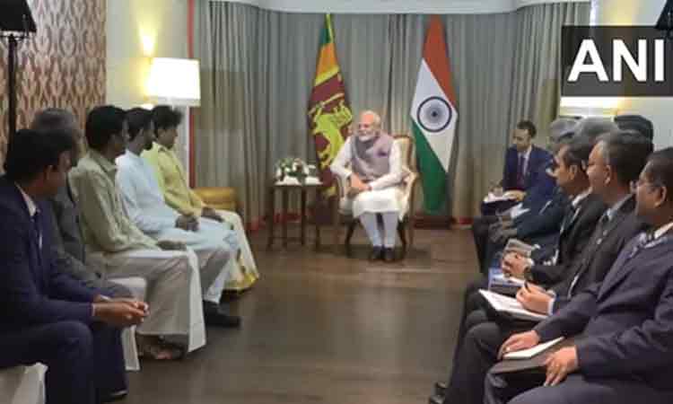 இலங்கையின் கொழும்பு நகரில் இந்திய வம்சாவளியை சேர்ந்த தலைவர்களை பிரதமர் மோடி நேரில் சந்தித்து பேசினார்.