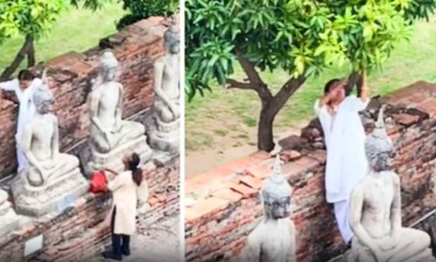 தாய்லாந்து அயுத்தயா கோவிலில் மாங்காய் எட்டவில்லை என புத்தர் சிலை மீது ஷூ காலோடு ஏறி மாங்காய் பறித்த பெண்களால் பரபரப்பு ஏற்பட்டது.