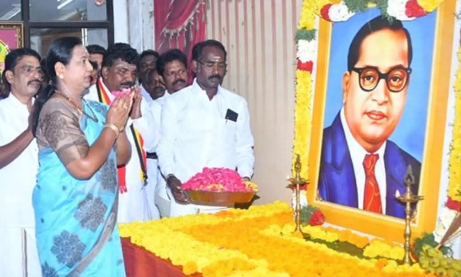 சட்டமேதை அண்ணல் அம்பேத்கரின் 135-வது பிறந்தநாளையொட்டி சென்னை கோயம்பேட்டில் உள்ள தேமுதிக அலுவலகத்தில் வைக்கப்பட்டுள்ள அவரது உருவப்படத்திற்கு தேமுதிக பொதுச்செயலாளர் பிரேமலதா மலர்தூவி மரியாதை செலுத்தினார்.