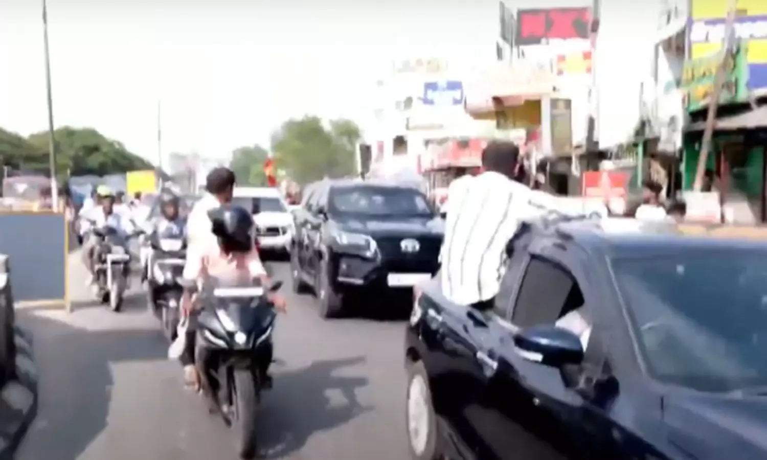 கோவையில் தொண்டர்கள் புடைசூழ கருத்தரங்குக்கு செல்லும் விஜய்