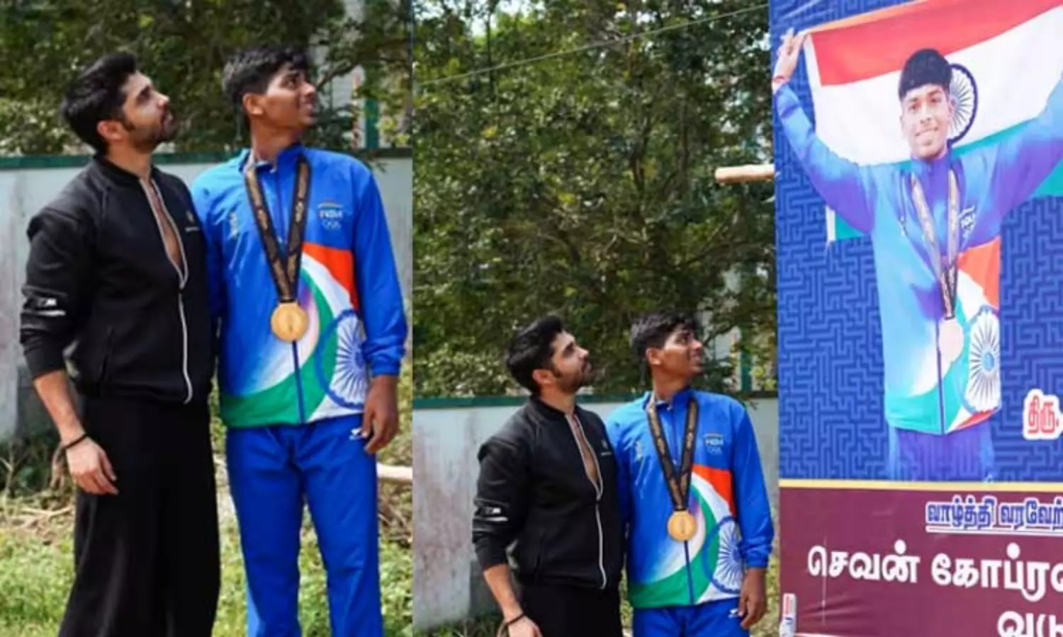 இதனை தொடர்ந்து, கபடி வீரர் அபினேஷை நேரில் சந்தித்து அரசியல் கட்சியினரும், திரை பிரபலங்களும் வாழ்த்து தெரிவித்து வருகின்றனர். இந்த நிலையில், பைசன் பட நடிகர் துருவ் விக்ரம் கபடி வீரர் அபினேஷை நேரில் சந்தித்து பாராட்டியுள்ளார். மேலும், அவருடன் எடுத்த புகைப்படத்தை தனது சமூக வலைத்தள பக்கத்தில் பகிர்ந்துள்ளார். அதில், "தேசத்தை பெருமைப்படுத்திய இளம் காளை. ஒவ்வொரு சகாப்தத்திற்கும் அதன் சொந்த பைசன் உள்ளது. இது அவருடையது. வாழ்த்துகள் தம்பி அபினேஷ். நீங்கள் எனக்கும், நம்பிக்கையுடன் கனவு காணும் ஒவ்வொரு இளைஞருக்கும் ஒரு உத்வேகம்." என்று பாராட்டி பதிவிட்டுள்ளார்.