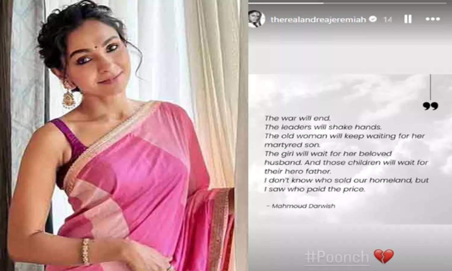 இந்நிலையில் பாகிஸ்தான் தாக்குதல் தொடர்பாக நடிகை ஆண்ட்ரியா தனது இன்ஸ்டாகிராம் பக்கத்தில் ஒரு ஸ்டோரி பதிவிட்டுள்ளார். பாலஸ்தீன எழுத்தாளரும், கவிஞருமாக மஹ்மூத் தர்விஷின் கவிதை ஒன்றை பகிர்ந்துள்ளார்.