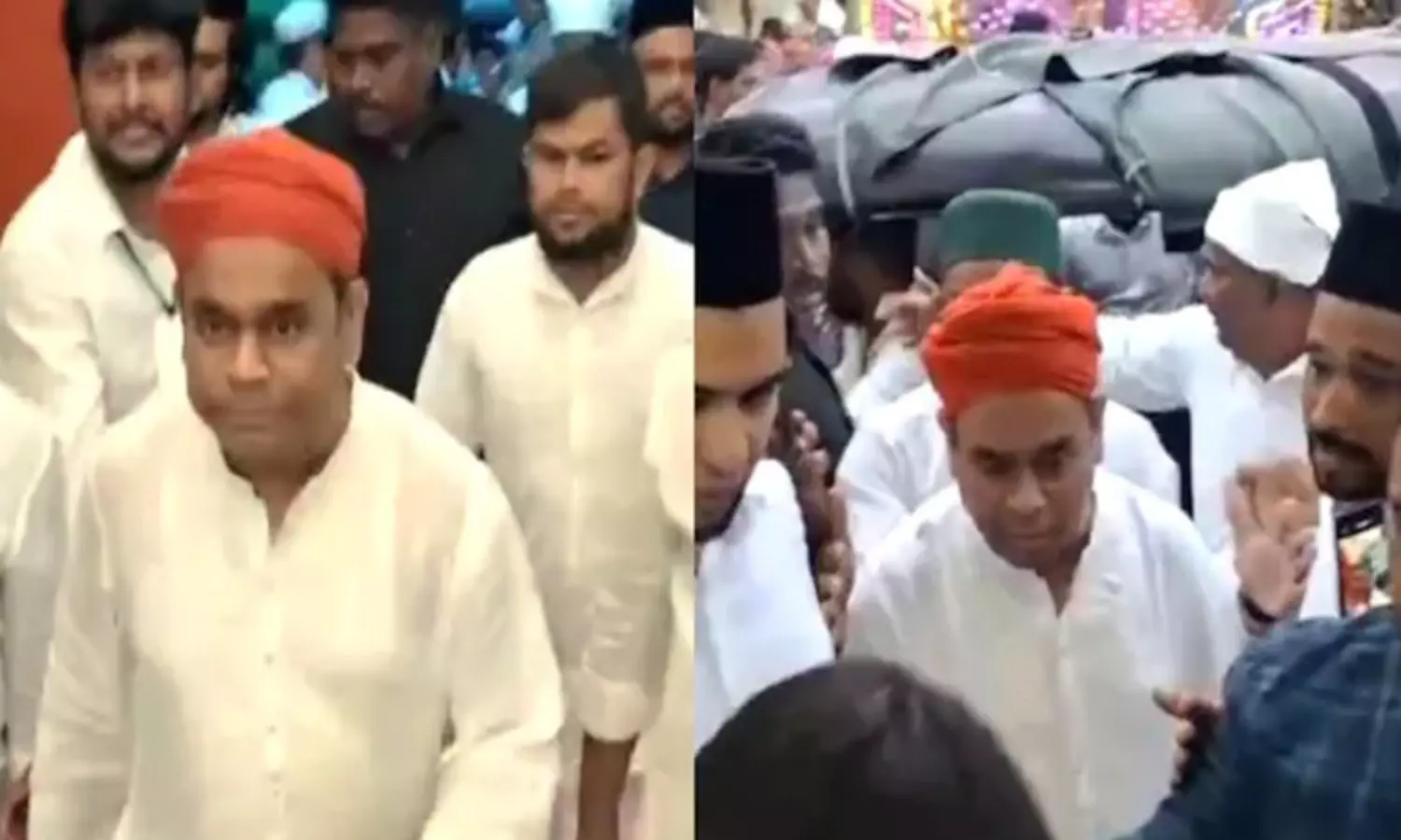 ஆட்டோவில் எளிமையாக வெள்ளை குர்தா அணிந்து வந்த ஏ.ஆர்.ரகுமான் சந்தனம் பூசும் நிகழ்வில் பங்கேற்றார்.;