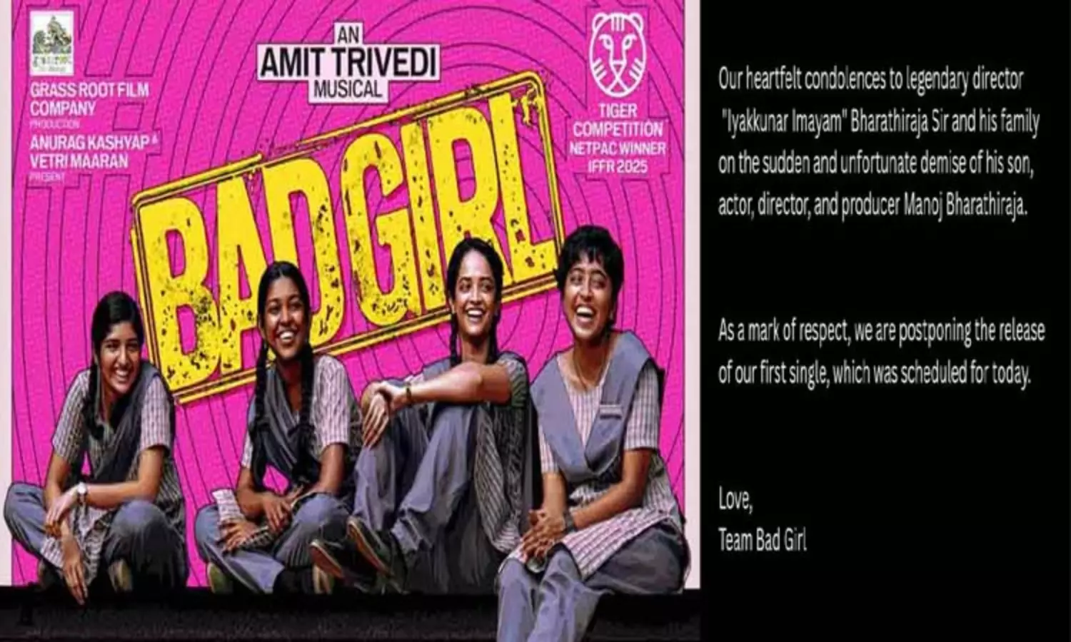 நடிகர் மனோஜ் பாரதிக்கு இரங்கல் தெரிவித்து, 'பேட் கேர்ள்' படத்தின் முதல் பாடலின் ரிலீஸ் ஒத்திவைக்கப்பட்டுள்ளதாக படக்குழு அறிவித்துள்ளது.;