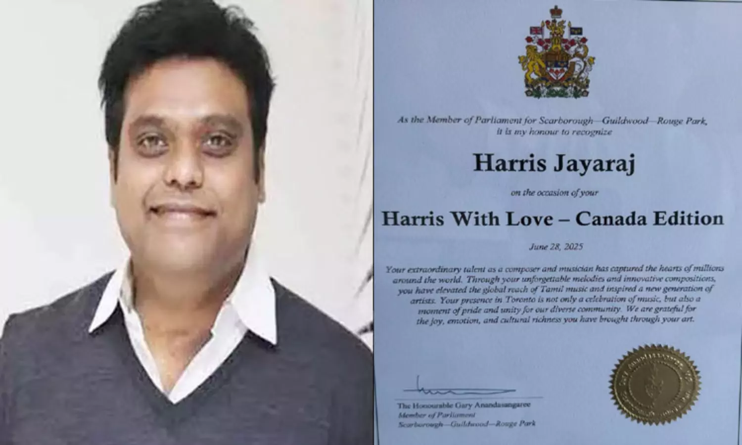 இசையமைப்பாளர் ஹாரிஸ் ஜெயராஜ் அண்மையில் நடத்திய இசை நிகழ்ச்சிக்காக கனடா அரசு அவரை கவுரவித்திருக்கிறது.;