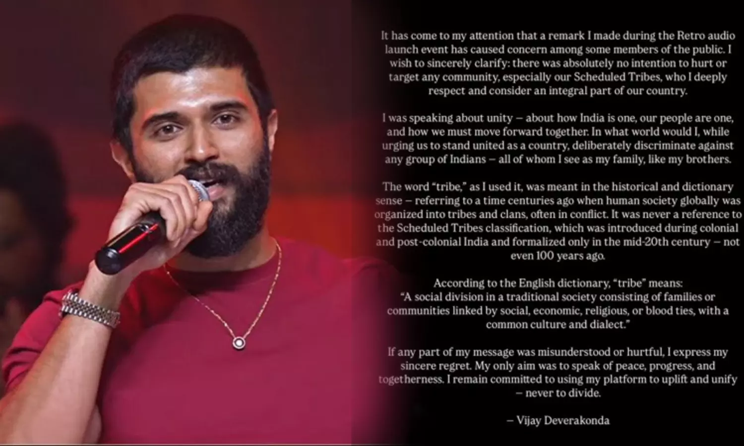 அப்போது அவர் இந்தியா - பாகிஸ்தான் விவகாரம் குறித்து பேசியது பெரும் சர்ச்சையை ஏற்படுத்தியது. இதனைத்தொடர்ந்து அவர் மீது காவல்நிலையத்தில் வழக்குப்பதிவு செய்யப்பட்டது. இந்நிலையில், சர்ச்சை பேச்சுக்கு நடிகர் விஜய் தேவரகொண்டா விளக்கம் கொடுத்துள்ளார்.