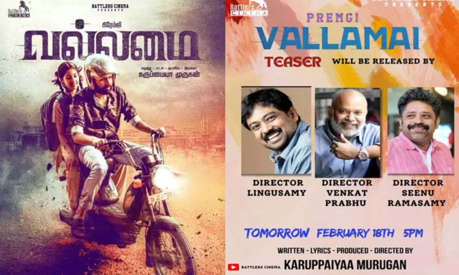 வல்லமை படத்தின் டீசரை இயக்குனர்கள் வெங்கட் பிரபு, லிங்குசாமி, சீனு ராமசாமி ஆகி்யோர் இணைந்து வெளியிட உள்ளனர். கருப்பையா முருகன் இயக்கத்தில் பிரேம்ஜி நடிக்கும் "வல்லமை" படத்தின் டீசர் இன்று மாலை 5 மணிக்கு வெளியாகுமென படக்குழு அறிவித்துள்ளது.