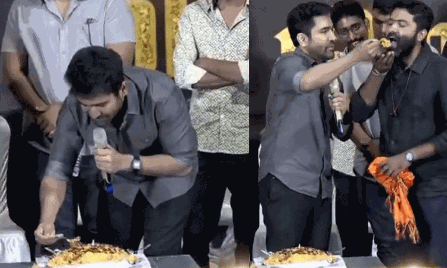 நடிகர் விஜய் ஆண்டனி ‘சக்தித் திருமகன்’ பட விழாவில் பிரியாணியை கேக்காக வெட்டி தன் பிறந்தநாளை கொண்டாடினார்.;