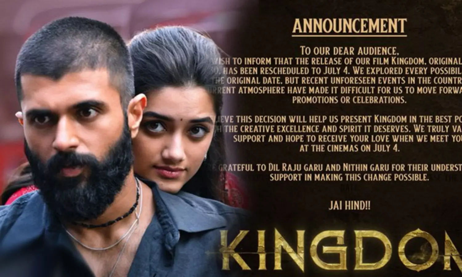 இந்நிலையில், இப்படம் தள்ளிபோயுள்ளது. அதன்படி, 'கிங்டம்' படம் வருகிற 30-ம் தேதிக்கு பதில் ஜூலை 4-ம் தேதி திரையரங்குகளில் வெளியாகும் என்று தெரிவிக்கப்பட்டுள்ளது.
