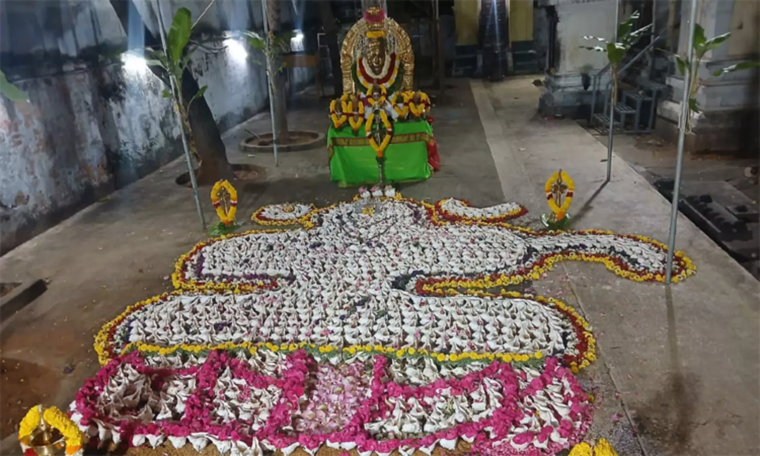 1008 வலம்புரி சங்குகளை சிவலிங்க வடிவத்தில் அடுக்கி வடிவமைத்து வைத்து அதில் புனித நீர் நிரப்பி சங்குபூஜை நடத்தப்பட்டது.;