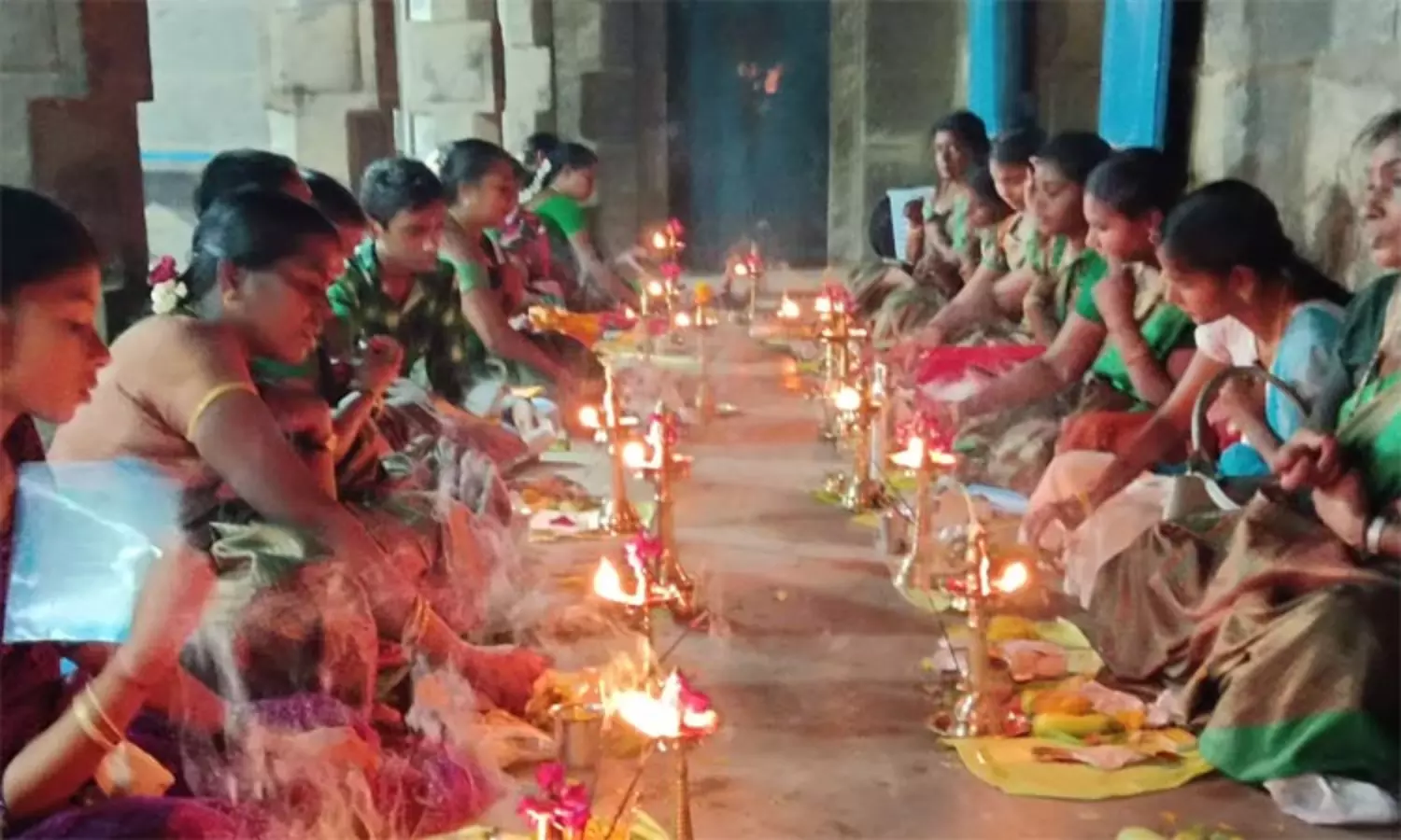 அங்கு பஜனை, பெண்கள் மாநாடு மற்றும் ஆன்மீக சொற்பொழிவைத் தொடர்ந்து கோவில் வளாகத்தில் 1008 திருவிளக்கு பூஜை நடந்தது. திருவிளக்கு பூஜையை கன்னியாகுமரி விவேகானந்த கேந்திராவின் அகில பாரத இணைப் பொதுச் செயலாளர் ரேகா தவே குத்து விளக்கு ஏற்றி தொடங்கி வைத்தார். அதைத்தொடர்ந்து கோவிலின் உட்பிரகாரம், வெளிப்பிரகாரம் ஆகிய இடங்களில் பெண்கள் அமர்ந்து திருவிளக்கு பூஜையை நடத்தினார்கள். இதில் நெல்லை, குமரி, தூத்துக்குடி, தென்காசி, ராமநாதபுரம் ஆகிய 5 மாவட்டங்களை சேர்ந்த பெண்கள், கேந்திர தன்னார்வ தொண்டர்கள், யோகா பயிற்சியாளர்கள் உள்பட பலர் கலந்து கொண்டனர்.