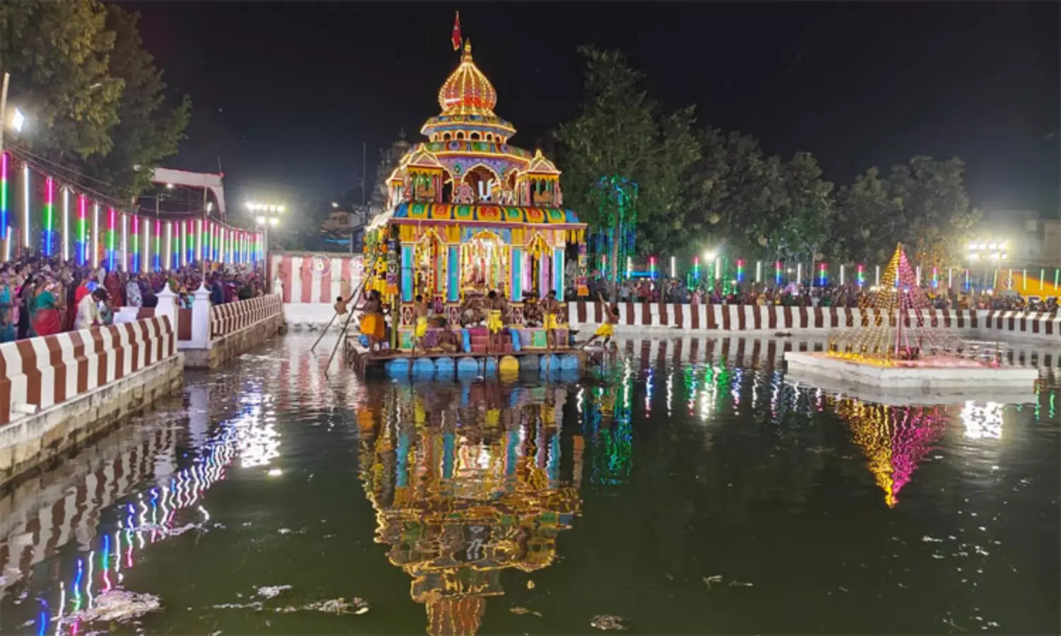 விழாவை முன்னிட்டு தெப்பம் வண்ண மின் விளக்குகளால் அலங்கரிக்கப்பட்டு ஜொலித்தது. இதில் ஏராளமான பக்தர்கள் கலந்து கொண்டு சாமி தரிசனம் செய்தனர்.