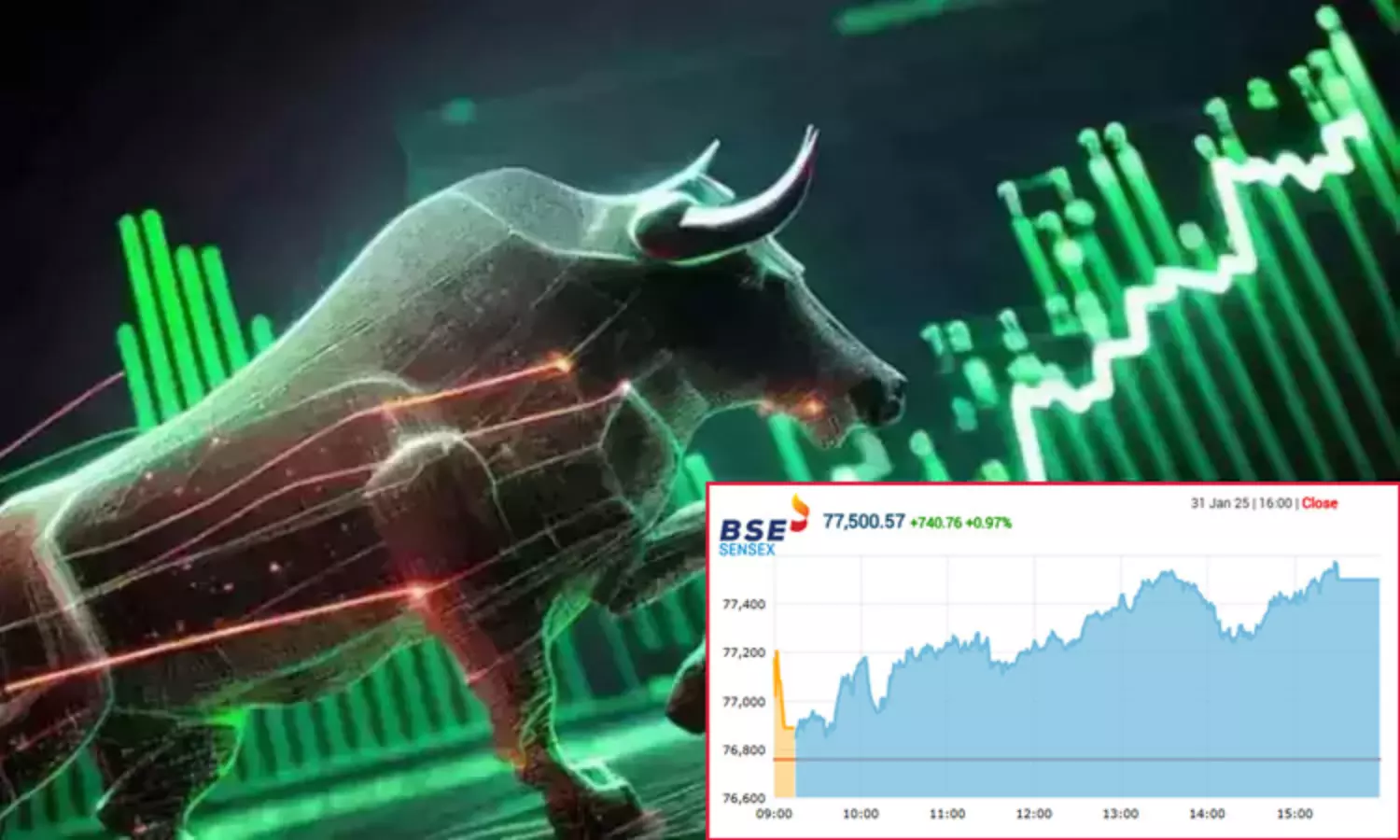 இன்றைய வர்த்தகத்தின் நிறைவில் சென்செக்ஸ் 740.76 புள்ளிகள் உயர்ந்து 77,500.57 புள்ளிகளில் நிலைபெற்றது.;