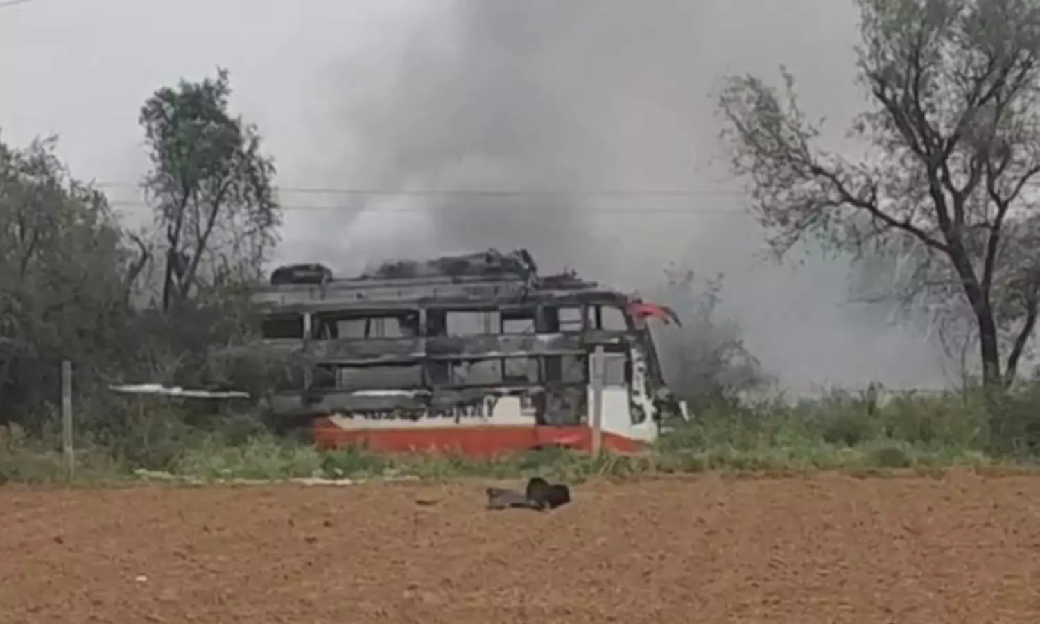 அந்த பஸ்சின் மேற்கூரையில் அதிக அளவிலான பொருட்கள் வைக்கப்பட்டிருந்தன. இந்நிலையில், பஸ் நெடுஞ்சாலையில் சென்றுகொண்டிருந்தபோது தாழ்வாக சென்ற மின்கம்பி அறுந்து பஸ்சின் மீது விழுந்தது. இதில் பஸ் முழுவதும் உடனடியாக தீப்பற்றியது. தீ மளமளவென பரவியநிலையில் டிரைவர் உடனடியாக பஸ்சை நிறுத்தியுள்ளார்.