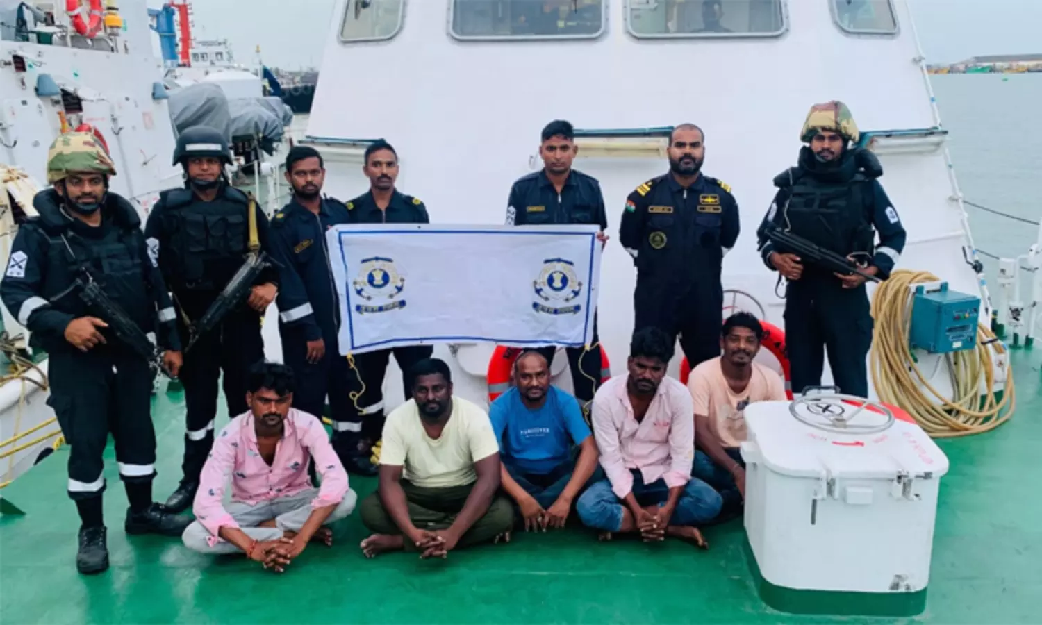 கடலோர காவல்படை கப்பல் நெருங்கி வருவதைக் கண்டதும், ஊடுருவல்காரர்கள் தங்கள் படகில் தப்பிச் செல்ல முயன்றனர்.;