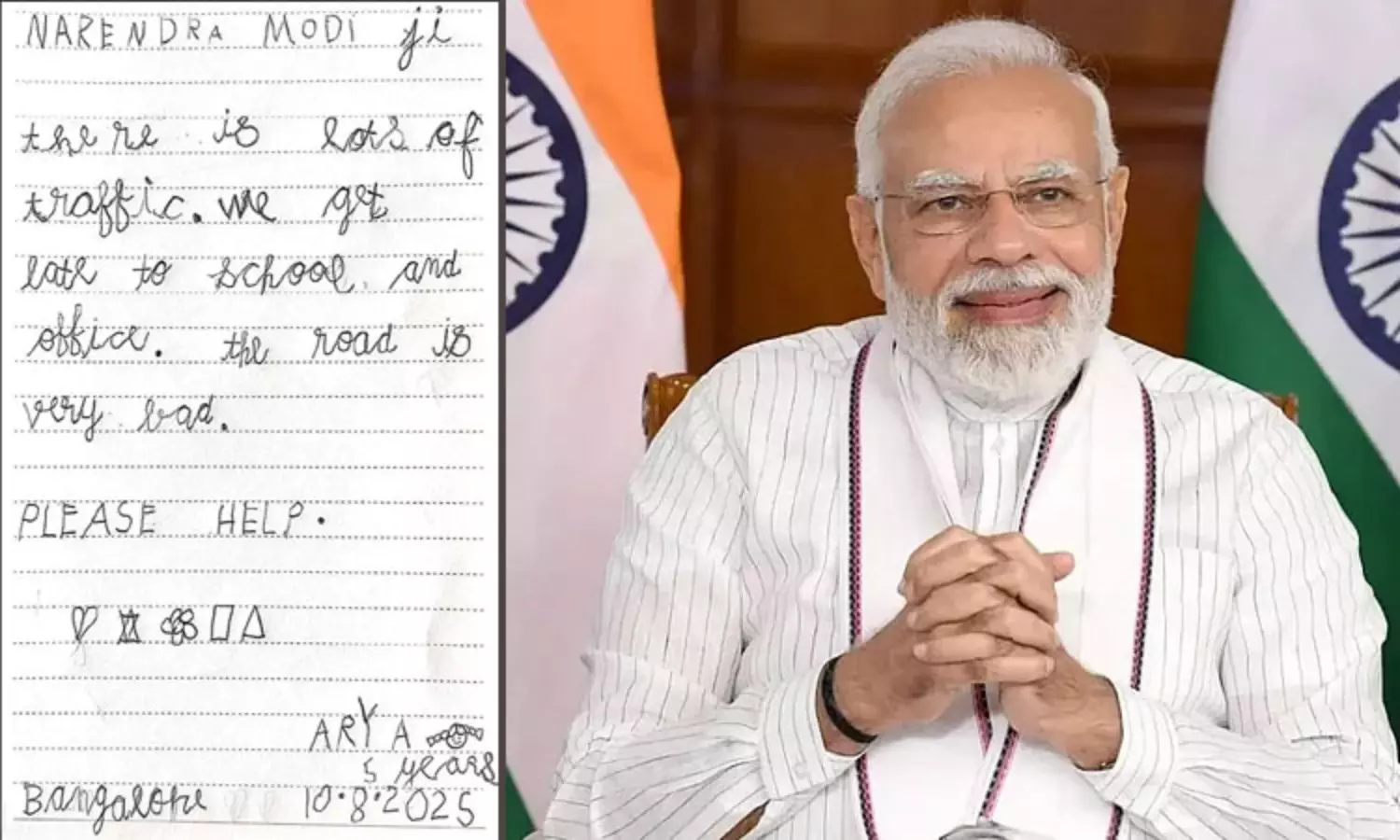 “நரேந்திர மோடி ஜி” போக்குவரத்து நெரிசல் அதிகம். நாங்கள் பள்ளிக்கு செல்ல தாமதம் ஆகிறது. அதுபோல் வேலைக்கு செல்வோரும் அலுவலகத்திற்கு செல்லவும் சிரமப்படுகிறார்கள். அதுமட்டுமின்றி சாலையும் மிகவும் மோசமாக உள்ளது. தயவு செய்து உதவுங்கள்” இவ்வாறு அவர் கூறியுள்ளார். இந்த கடிதம் சமூகவலைதளங்களிலும் வைரலாகி வருகிறது.