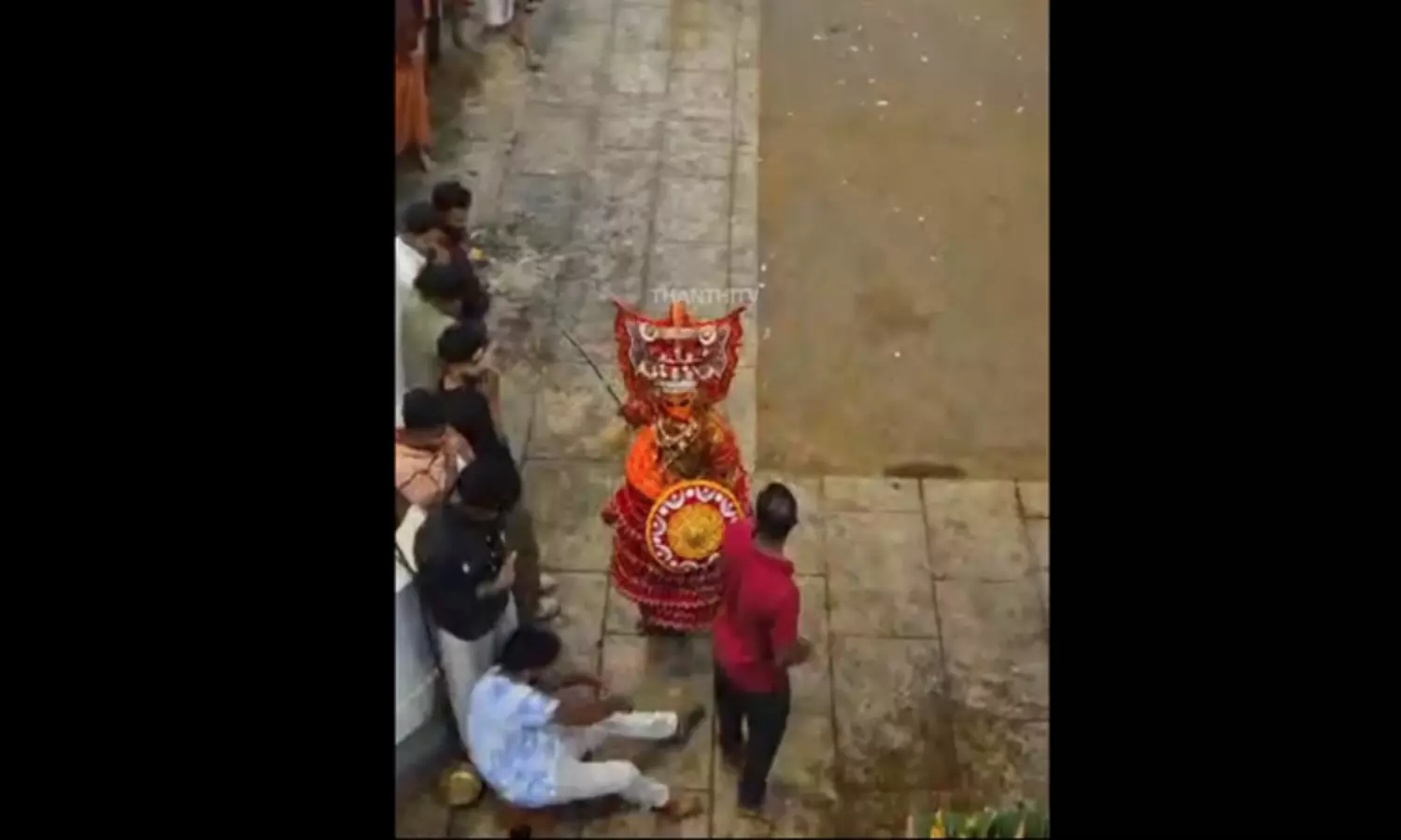 கேரள மாநிலம் காசர்கோடு மாவட்டத்திற்கு உட்பட்ட நீலேஸ்வரம் பகுதியில் விஷ்ணு விஷ்ணு மூர்த்தி கோயில் உள்ளது இக்கோயிலில் திருவிழாவில் தெய்யம் எனப்படும் பாரம்பரிய வேடம் அணிந்து நடனமாடும் நிகழ்ச்சி நடைபெறுவது வழக்கம். அதன்படி, நிகழ்ச்சி நடைபெற்றுக் கொண்டிருந்தது. திரளான பக்தர்கள் கூடி திருவிழாவை கண்டுகொண்டிருந்தனர். திருவிழாவில் தெய்யம் ஆடுபவர் ஒரு பக்தரை திடீரென தாக்கினார்.