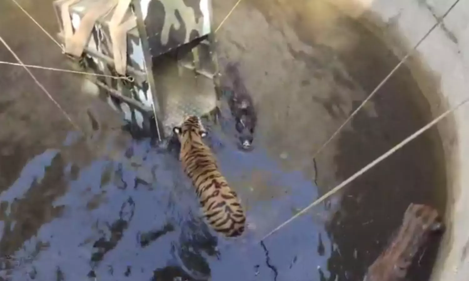 இந்த வீடியோவில், கிணற்றில் தவறி விழுந்த ஒரு புலியும், ஒரு காட்டுப் பன்றியும் மேலே வர முடியாமல் கிணற்றில் சண்டையிடாமல் அமைதியாக நீந்திக் கொண்டிருக்கின்றன. மீட்புக் குழுவினர் ஒரு கட்டிலையும், ஒரு கூண்டையும் கிரேன் மூலம் கிணற்றுக்குள் கயிறு கட்டி மீட்க முயற்சி செய்கின்றனர். இதில் புலி கூண்டுக்குள் சென்றதும் அதன் கதவை மூடி கிரேன் மூலம் மேலே தூக்குகின்றனர். அதே போல, காட்டுப் பன்றியையும் கட்டிலில் கட்டி மேலே தூக்கியுள்ளனர். இந்த வீடியோ சமூக வலைதளங்களில் வைரலாகி வருகிறது.