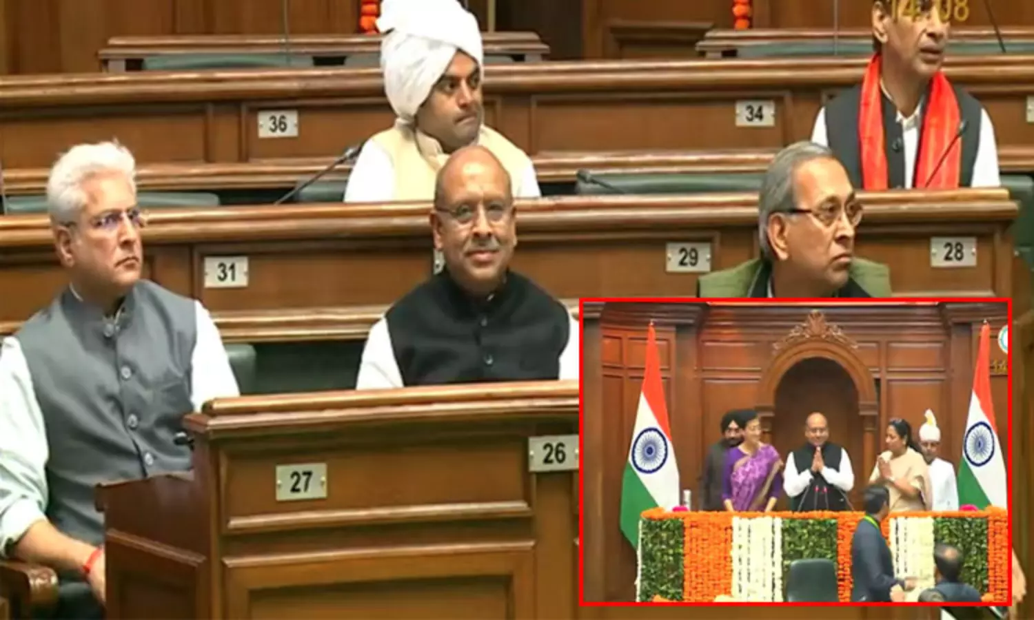 அவர், ரோகிணி சட்டசபை தொகுதியில் இருந்து எம்.எல்.ஏ.வாக தேர்ந்தெடுக்கப்பட்டவர். இதனை தொடர்ந்து, முதல்-மந்திரி ரேகா குப்தா மற்றும் சட்டசபையின் எதிர்க்கட்சி தலைவர் அதிஷி ஆகியோர் அவரை அழைத்து கொண்டு சென்று நாற்காலியில் அமர வைத்தனர்.