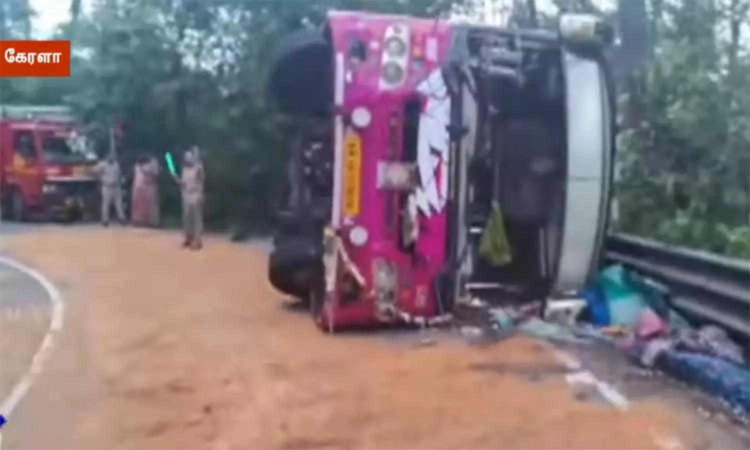 இடுக்கியில் உள்ள குட்டிக்கானம் வழியாக சென்றபோது ஓட்டுநரின் கட்டுப்பாட்டை இழந்து பேருந்து சாலையில் கவிழ்ந்தது.;