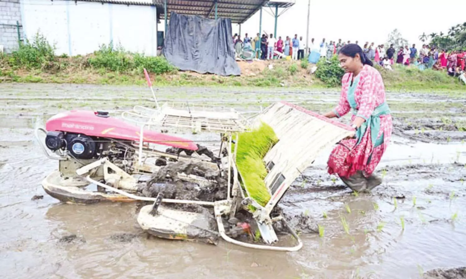 நவீன எந்திரம் மூலம் நெல் நடவு செய்த பெண் அதிகாரி
