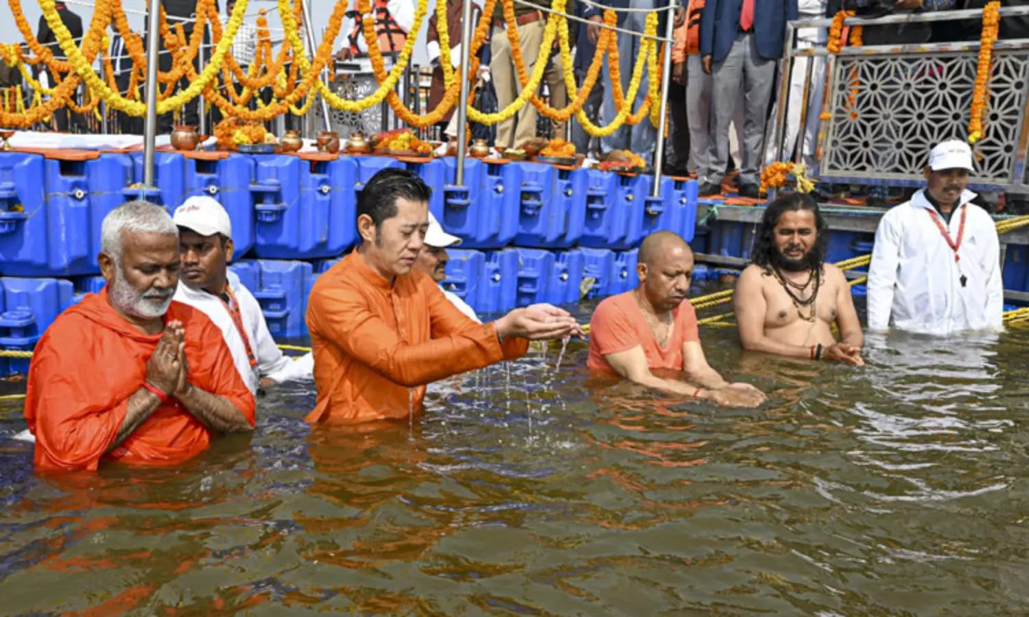 அவ்வகையில், பூடான் மன்னர் ஜிக்மே கேசர் நம்கியேல் வாங்சுக் இன்று திரிவேணி சங்கமத்தில் புனித நீராடினார். புனித நீராடுவதற்கு முன்பு சூரியனுக்கு 'அர்க்யா' சமர்ப்பித்தல் போன்ற சடங்குகளை செய்தார். அவருடன் உத்தர பிரதேச முதல் மந்திரி யோகி ஆதித்யநாத், மந்திரிகள் சுதந்திர தேவ் சிங் மற்றும் நந்த கோபால் குப்தா ஆகியோரும் பங்கேற்று புனித நீராடினார்.