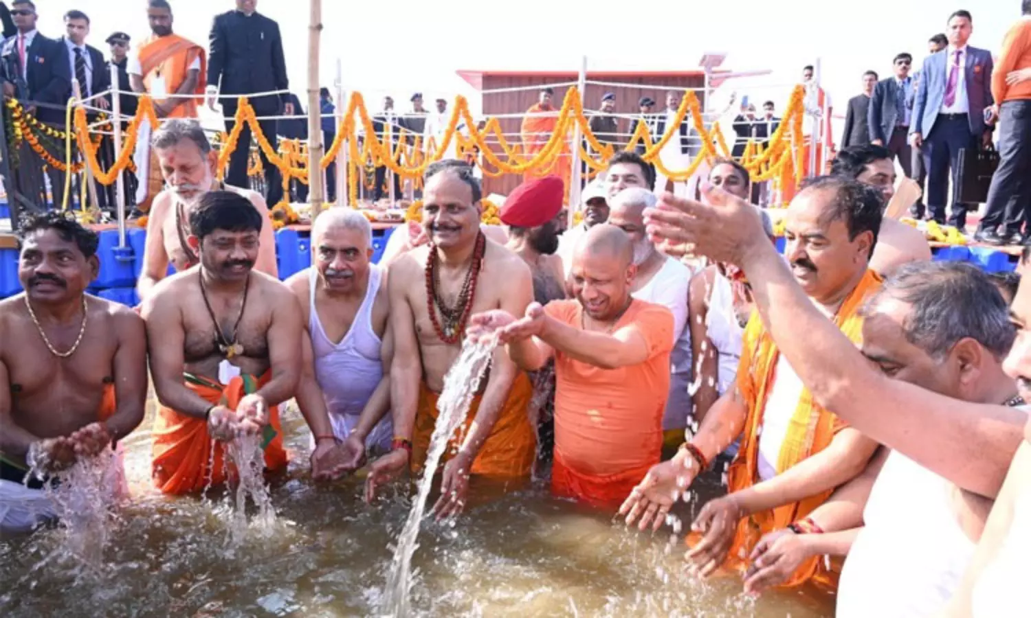இந்த நிலையில் மகா கும்பமேளா நடைபெறும் பிரயாக்ராஜில் உத்தர பிரதேச மாநில முதல்-மந்திரி யோகி ஆதித்யநாத் தலைமையில் சிறப்பு மந்திரிசபை கூட்டம் நடைபெற்றது. இந்த சிறப்பு மந்திரிசபை கூட்டத்திற்கு பிறகு மதியம் 2.15 மணியளவில் முதல்-மந்திரி யோகி ஆதித்யநாத், மாநில மந்திரிகளுடன் திரிவேணி சங்கமத்தில் உயர் பாதுகாப்புக்கு மத்தியில் புனித நீராடினார். அப்போது முதல்-மந்திரி மற்றும் மந்திரிகள் ஒருவர் மீது ஒருவர் தண்ணீரை தெளித்து கொண்டாட்டத்தில் ஈடுபட்டனர்.