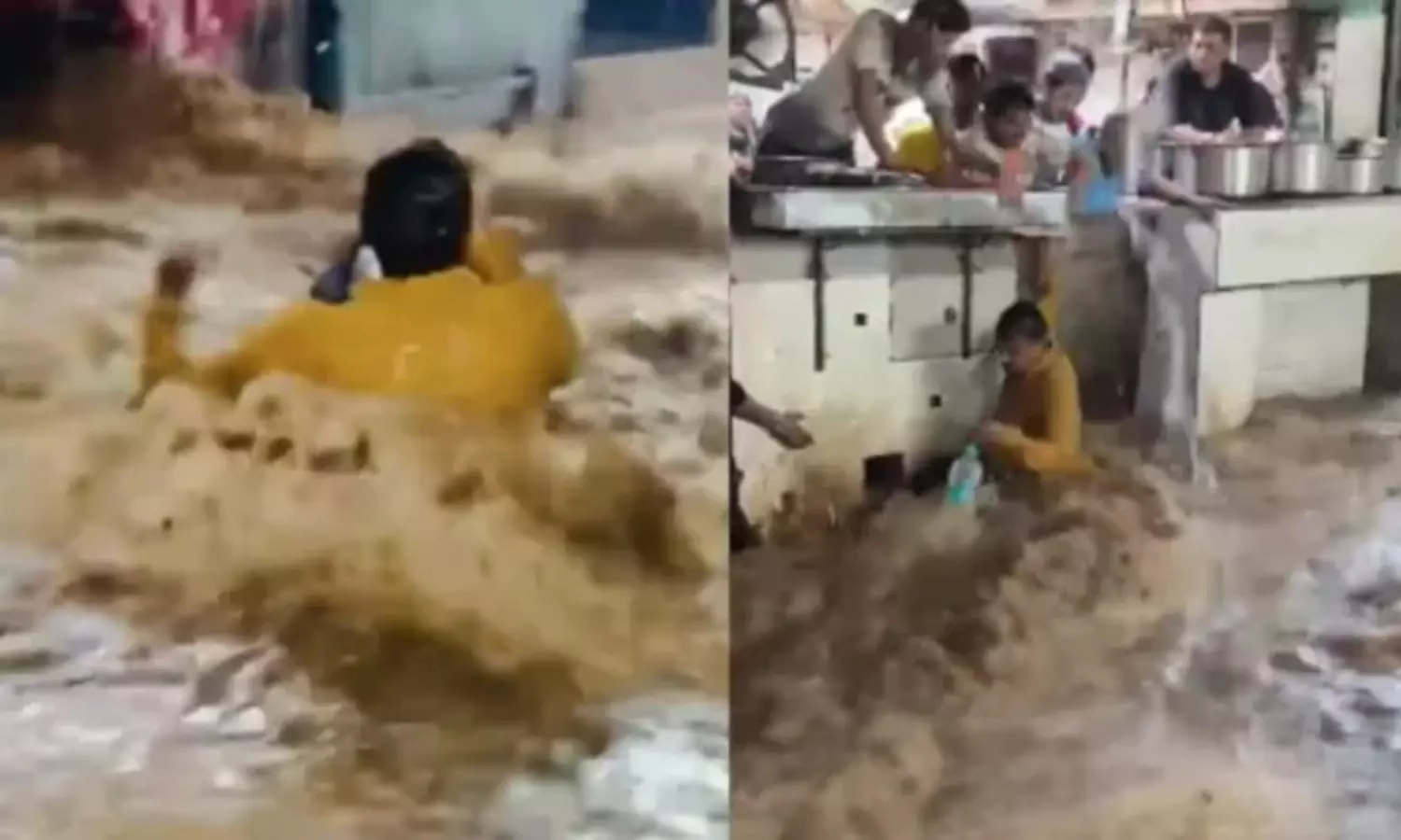 அப்போது, அப்பகுதியில் உள்ள டீக்கடைக்காரர் தக்க சமயத்தில் அந்த நபரை வெள்ளத்தில் இருந்து மீட்டார். டீக்கடை அருகே வெள்ளத்தில் அடித்து செல்லப்பட்டபோது அவரின் கையை பிடித்து டீக்கடைக்காரர் மீட்டார். இந்த சம்பவம் தொடர்பான வீடியோ தறோது சமூகவலைதளத்தில் வைரலாகி வருகிறது. அதேவேளை, ராஜஸ்தானில் மழை நீடிக்கக்கூடும் என்று வானிலை ஆய்வு மையம் எச்சரிக்கை விடுத்துள்ளது என்பது குறிப்பிடத்தக்கது.