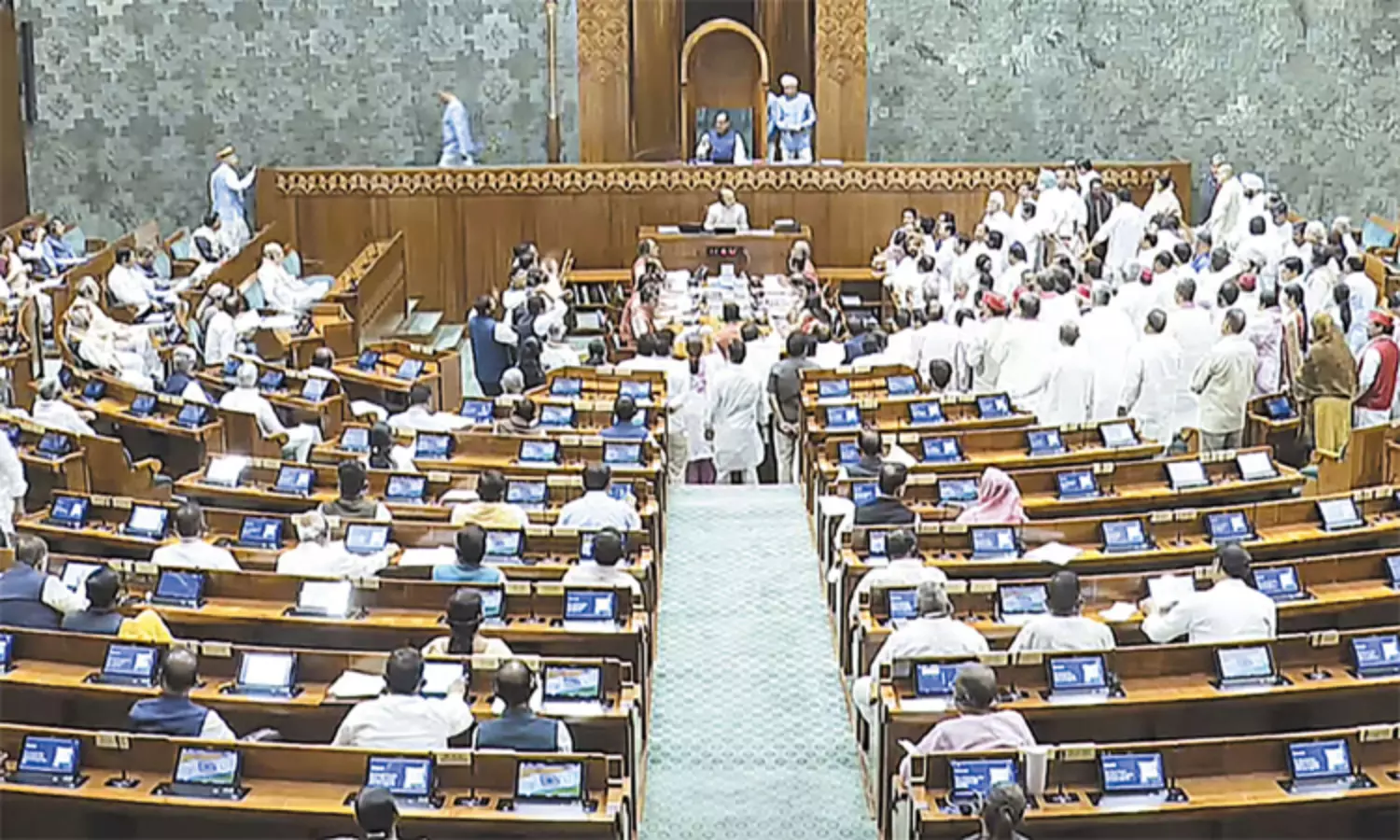 பின்னர், கேள்வி நேரம் எடுத்துக்கொள்ளப்பட இருந்தது. அப்போது, காங்கிரஸ் உள்ளிட்ட எதிர்க்கட்சி எம்.பி.க்கள் சபையின் மையப்பகுதிக்கு சென்று அமளியில் ஈடுபட்டனர். 'ஆபரேஷன் சிந்தூர்' நடவடிக்கை பற்றி விவாதம் நடத்த வேண்டும் என்று சபாநாயகர் இருக்கையை முற்றுகையிட்டு அவர்கள் கோரிக்கை விடுத்தனர்.