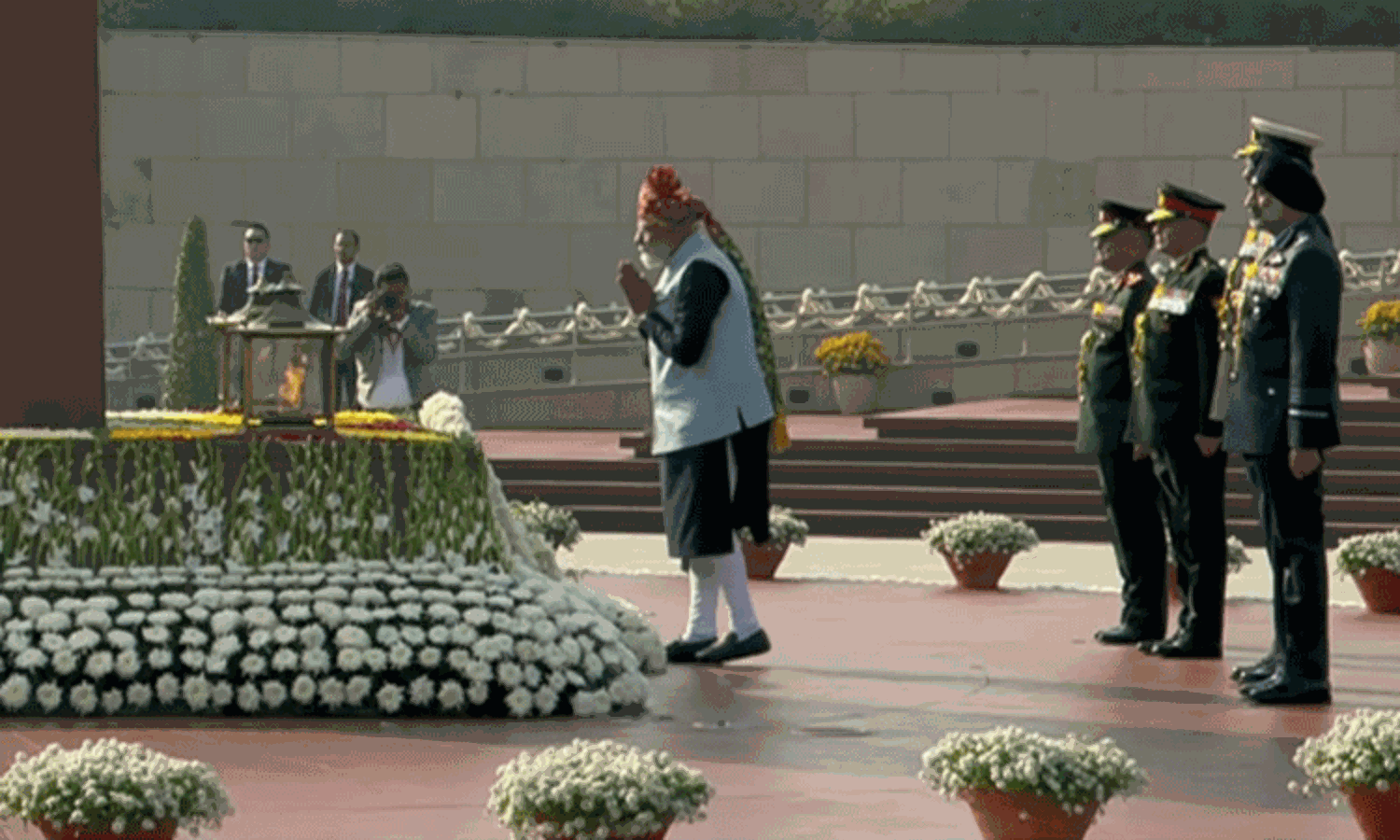 குடியரசு தினத்தையொட்டி, போர்களில் நாட்டுக்காக தங்களது இன்னுயிரை தியாகம் செய்த வீரர்களை நினைவுகூறும் வகையில், டெல்லி இந்தியா கேட் பகுதியில் உள்ள போர் வீரர்கள் நினைவிடத்துக்கு பிரதமர் மோடி சென்றார். அங்கு பிரதமர் மோடியை பாதுகாப்புத்துறை மந்திரி ராஜ்நாத் சிங் முப்படைகளின் தளபதிகள் வரவேற்றனர்.