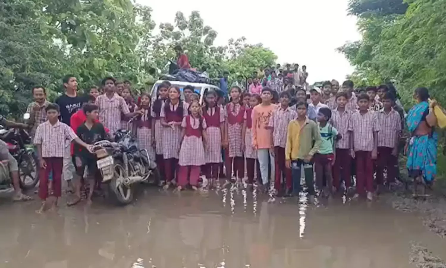 அப்பகுதியில் உள்ள பள்ளிக்கு மாணவ - மாணவியர் இந்த சாலை வழியாக செல்வது வழக்கம். ஆனால், கனமழையால் சாலை குண்டும் குழியுமான தண்ணீர் தேங்கி இருந்ததால் மாணவ-மாணவியர் மிகுந்த சிரமம் அடைந்தனர். சாலையை சீரமடைத்து தருமாறு கிராமத்தினர் அதிகாரிகளிடம் பலமுறை முறையிட்டனர். ஆனால், அதிகாரிகள் எந்த நடவடிக்கையும் எடுக்காமல் அலட்சியம் காட்டினர்.