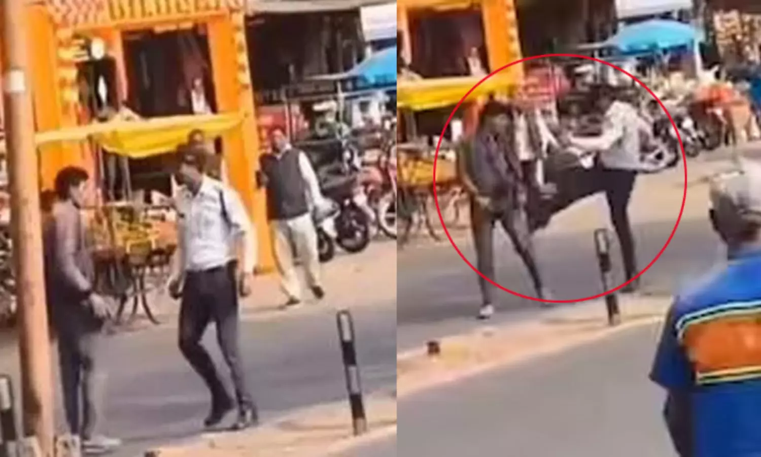 கீழே விழுந்த நபர் எழுந்து அங்கிருந்து நடந்து சென்றார். அப்போது போக்குவரத்து காவலர் அந்த நபரை எட்டி உதைத்து, கண்ணத்தில் அறைந்தார். இந்த சம்பவத்தை அங்கிருந்தவர்கள் செல்போனில் படம்பிடித்துள்ளனர். தற்போது இந்த காட்சிகள் சமூக வலைதளங்களில் வைரலாகி வருகின்றன.