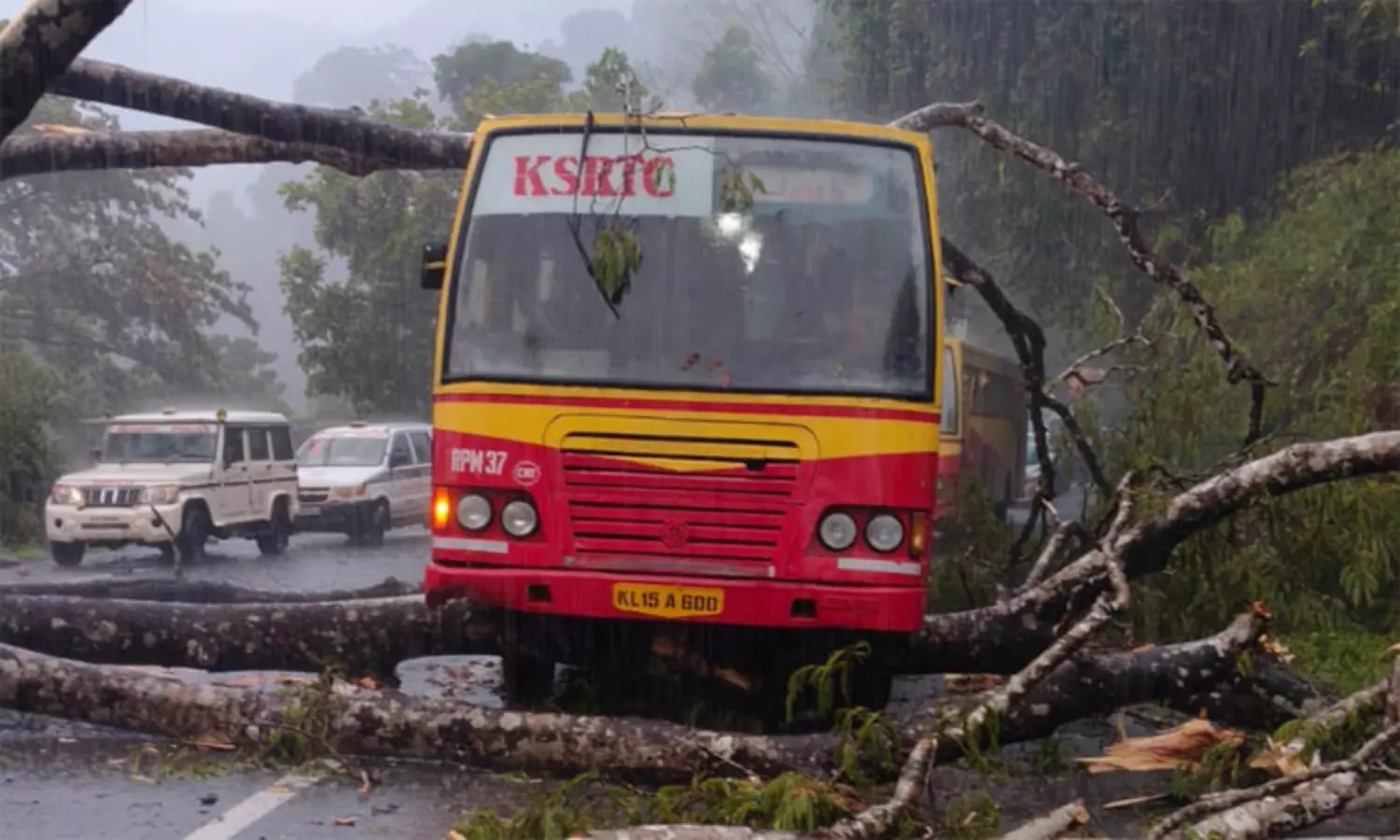 இந்த நிலையில்,பம்பையில் இருந்து நிலக்கல்லுக்கு சபரிமலை பக்தர்கள் சென்ற கேரள அரசு பஸ் மீது மரம் ஒன்று திடீரென விழுந்தது. இதில் பஸ்சின் மேற்கூரை சேதமடைந்தது. நல்வாய்ப்பாக பஸ்சில் பயணித்த அய்யப்ப பக்தர்கள் யாருக்கும் காயம் ஏற்படவில்லை என்று கூறப்படுகிறது. தகவலறிந்து பம்பையில் இருந்து வந்த தீயணைப்புத் துறையினர் பஸ்சின் மீது விழுந்த மரத்தை அப்புறப்படுத்தி மாற்றுப் பஸ் மூலம் பக்தர்களை அனுப்பி வைத்தனர். இதனால் அங்கு சிறிது நேரம் போக்குவரத்து பாதிக்கப்பட்டது.
